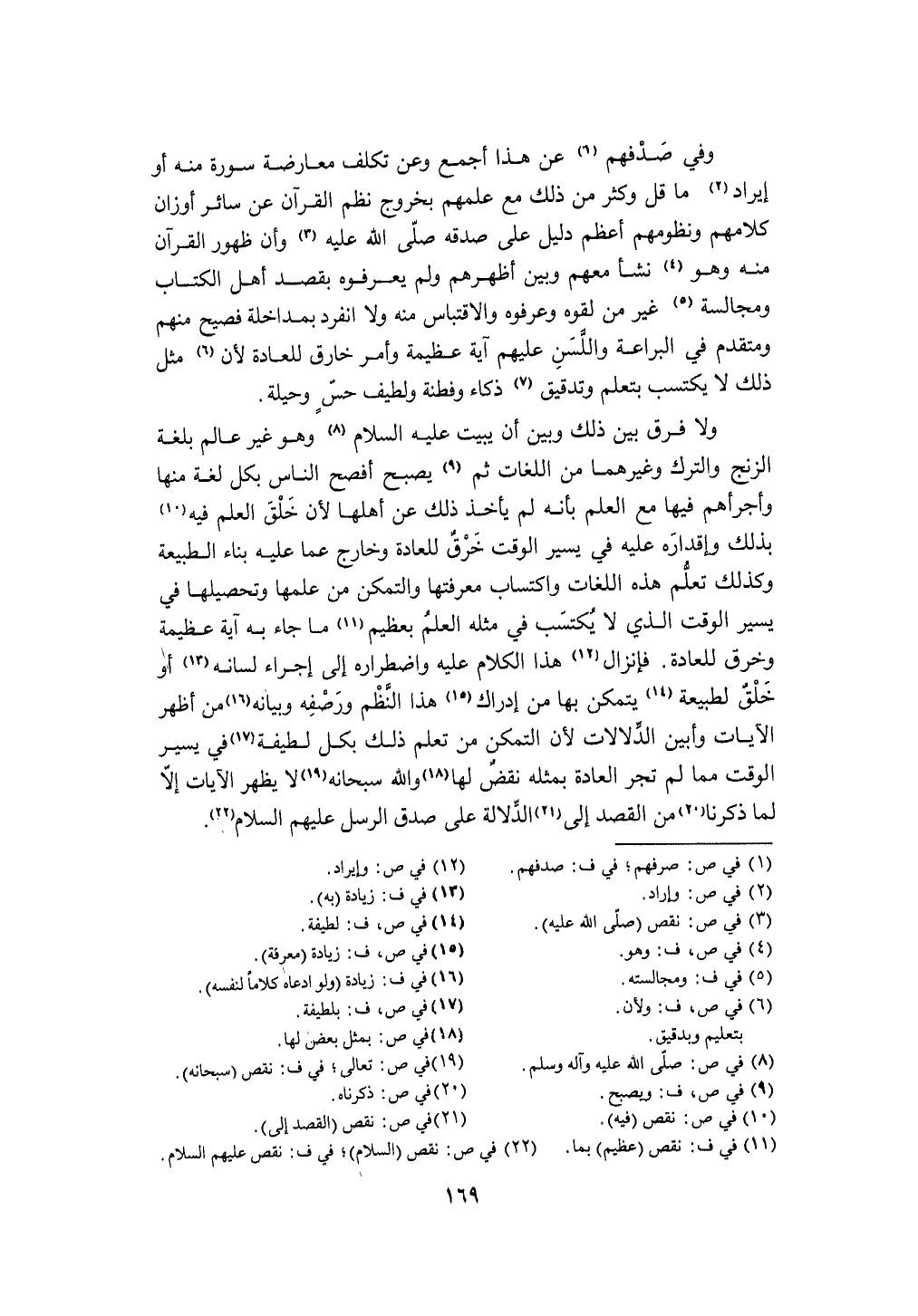 وَلَا فرق بَين ذَلِك وَبَين أَن يبيت صلى الله عَلَيْهِ وَسلم وَهُوَ غير عَالم بلغَة الزنج وَالتّرْك وَغَيرهمَا من اللُّغَات ثمَّ يصبح أفْصح النَّاس بِكُل لُغَة مِنْهَا وأجرأهم فِيهَا مَعَ الْعلم بِأَنَّهُ لم يَأْخُذ ذَلِك عَن أَهلهَا لِأَن خلق الْعلم فِيهِ بذلك وإقدراه عَلَيْهِ فِي يسير الْوَقْت خرق للْعَادَة وخارج عَمَّا عَلَيْهِ بِنَاء الطبيعة وَكَذَلِكَ تعلم هَذِه اللُّغَات واكتساب مَعْرفَتهَا والتمكن من علمهَا وتحصيلها فِي يسير الْوَقْت الَّذِي لَا يكْتَسب فِي مثله الْعلم بعظيم مَا جَاءَ بِهِ آيَة عَظِيمَة وخرق للْعَادَة