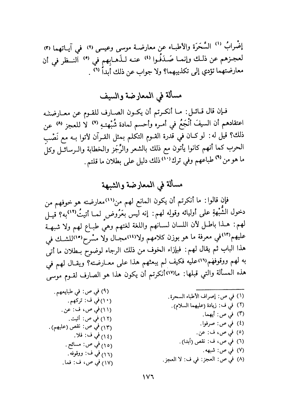 فَإِن قَالَ قَائِل مَا أنكرتم أَن يكون الصَّارِف للْقَوْم عَن معارضته اعْتِقَادهم أَن السَّيْف أنجع فِي أمره وأحسم لمادة شبهته لَا للعجز عَن ذَلِك قيل لَهُ لَو كَانَ فِي قدرَة الْقَوْم التَّكَلُّم بِمثل الْقُرْآن لأتوا بِهِ مَعَ نصب الْحَرْب كَمَا أَنهم كَانُوا يأْتونَ مَعَ ذَلِك بالشعر وَالرجز والخطابة والرسائل وكل مَا هُوَ من طباعهم وَفِي ترك ذَلِك دَلِيل على بطلَان مَا قُلْتُمْ