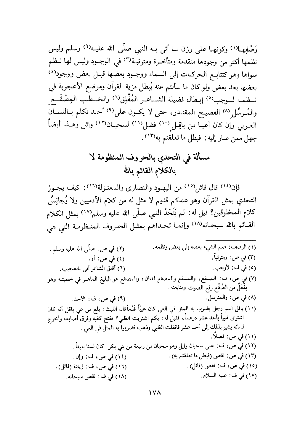 مَسْأَلَة فِي التحدي بالحروف الْمَنْظُومَة لَا بالْكلَام الْقَائِم بِاللَّه