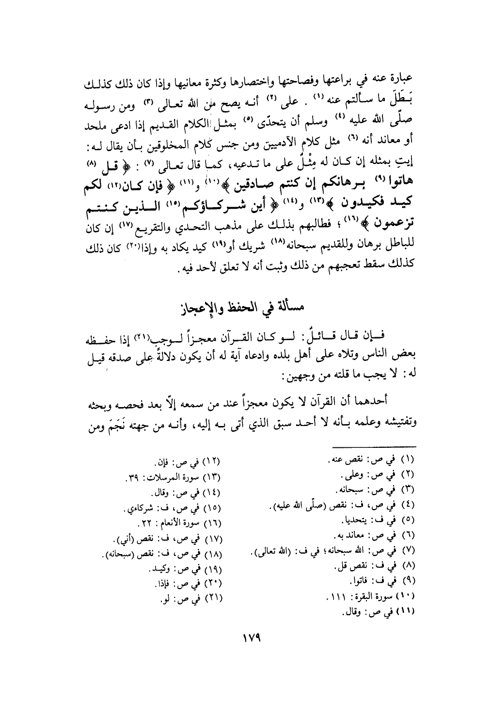 فَإِن قَالَ قَائِل لَو كَانَ الْقُرْآن معجزا لوَجَبَ إِذا حفظه بعض النَّاس وتلاه على أهل بَلَده وادعاه آيَة لَهُ أَن يكون دلَالَة على صدقه قيل لَهُ لَا يجب مَا قلته من وَجْهَيْن أَحدهمَا أَن الْقُرْآن لَا يكون معجزا عِنْد من سَمعه إِلَّا بعد فحصه وبحثه وتفتيشه وَعلمه بِأَنَّهُ لَا أحد سبق الَّذِي أَتَى بِهِ إِلَيْهِ وَأَنه من جِهَته نجم وَمن