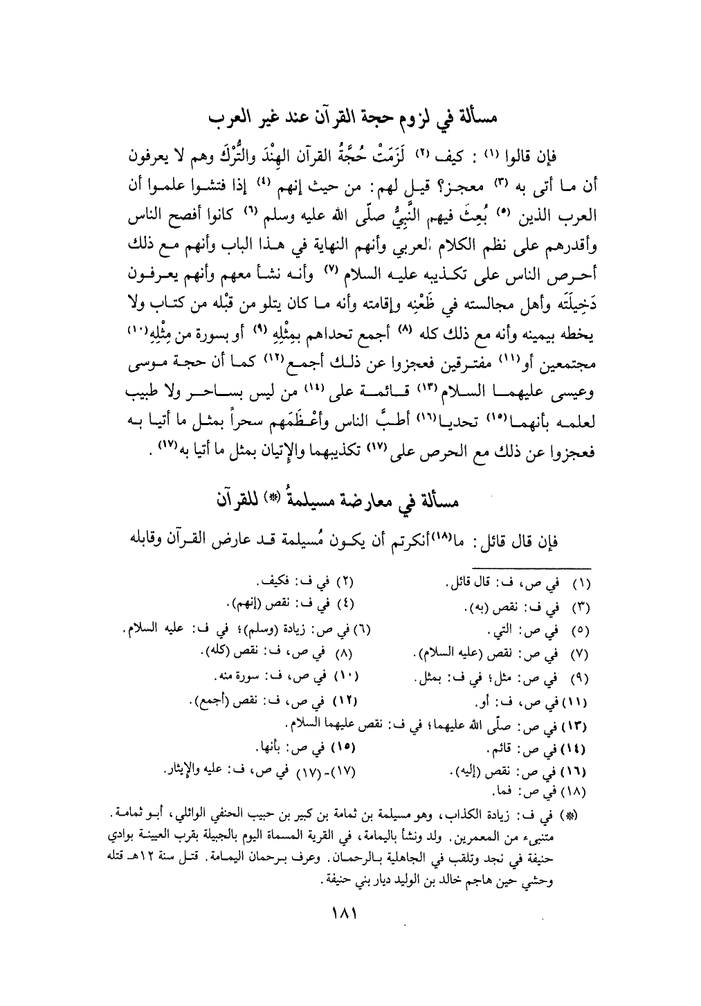 فَإِن قَالَ قَائِل مَا أنكرتم أَن يكون مُسَيْلمَة قد عَارض الْقُرْآن وقابله