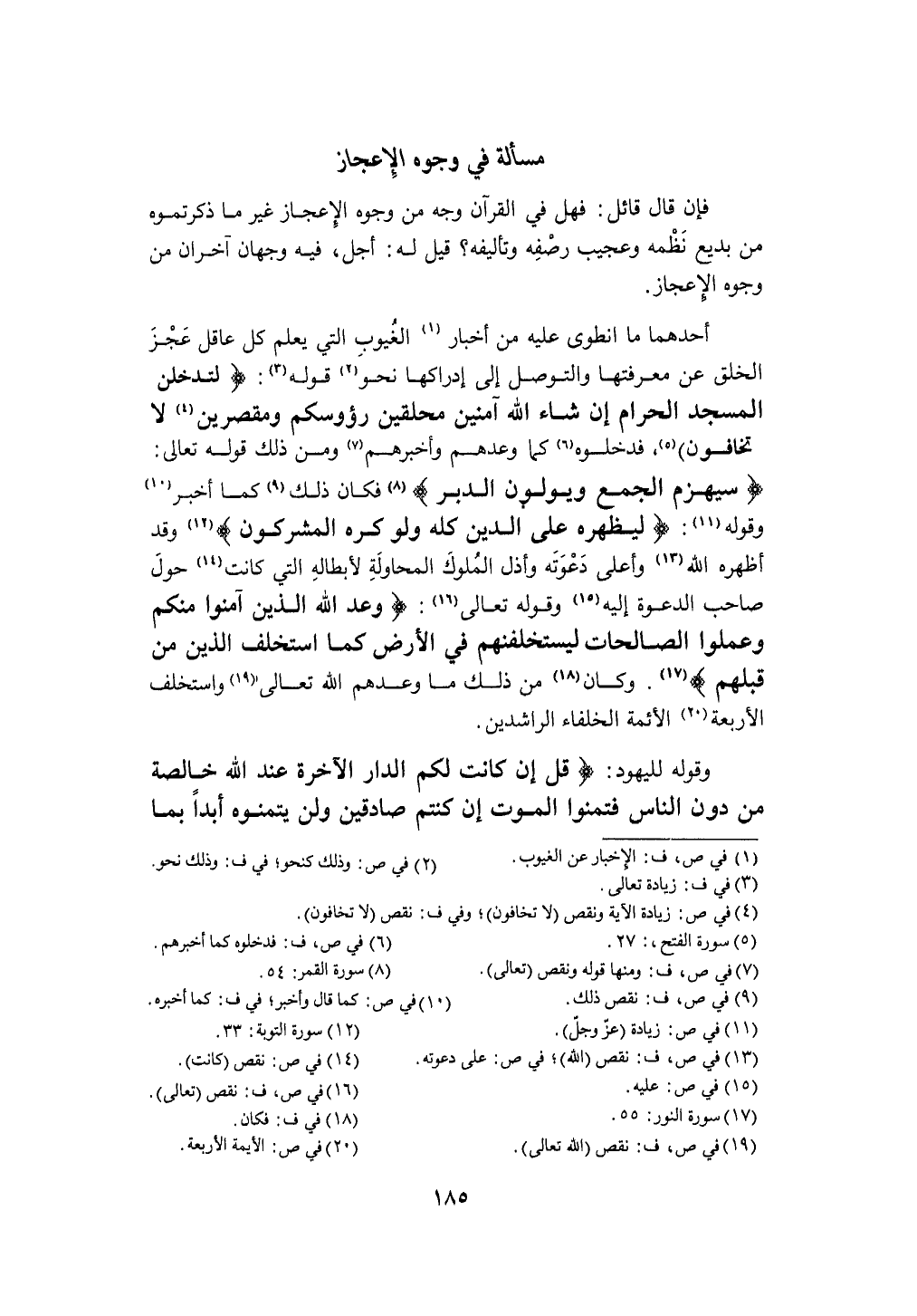 فَإِن قَالَ قَائِل فَهَل فِي الْقُرْآن وَجه من وُجُوه الإعجاز غير مَا ذكرتموه من بديع نظمه وَعَجِيب رصفه وتأليفه قيل لَهُ أجل فِيهِ وَجْهَان آخرَانِ من وُجُوه الإعجاز
