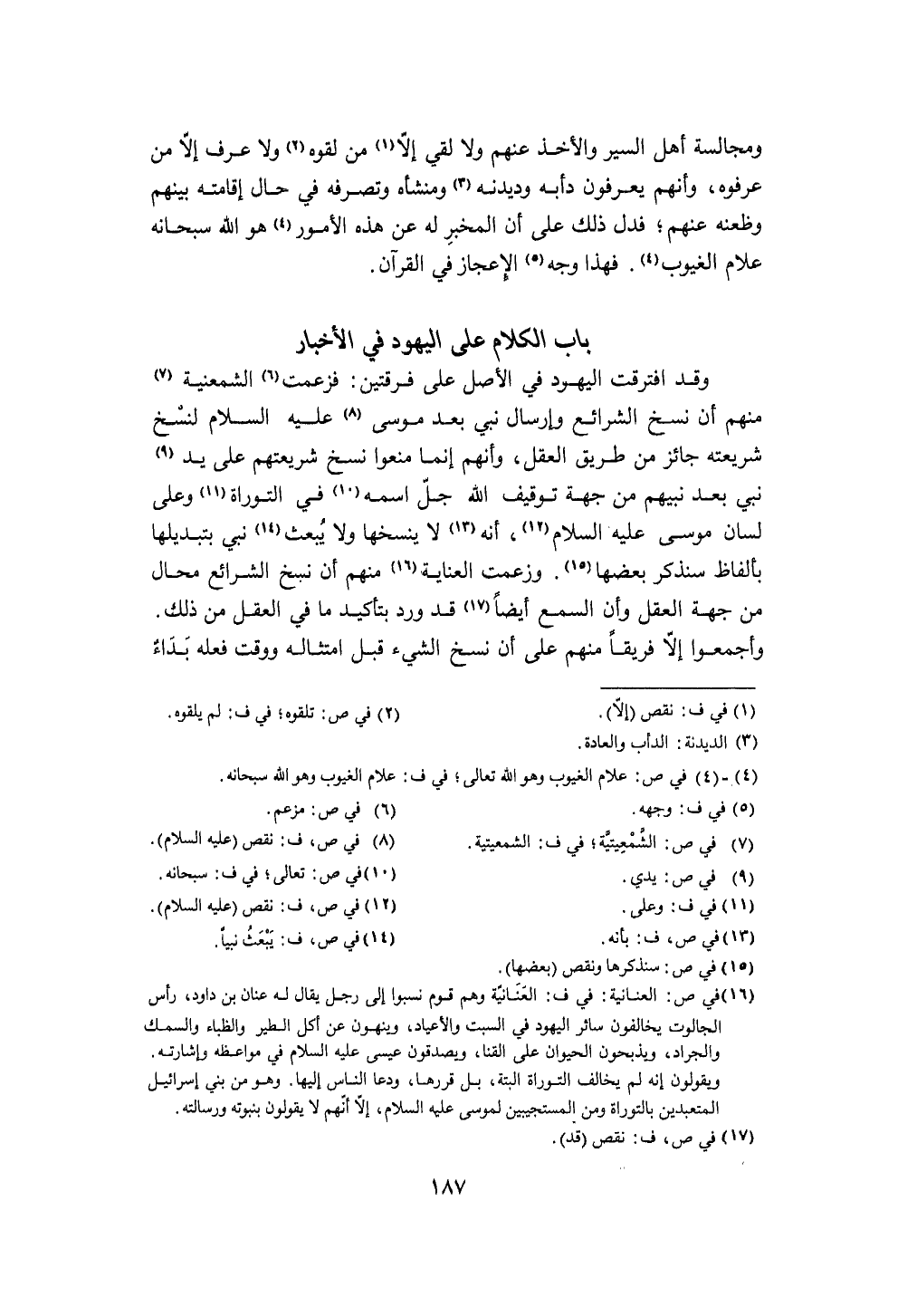 وَقد افْتَرَقت الْيَهُود فِي الأَصْل على فرْقَتَيْن فَزَعَمت الشمعنية مِنْهُم أَن نسخ الشَّرَائِع وإرسال نَبِي بعد مُوسَى عَلَيْهِ السَّلَام لنسخ شَرِيعَته جَائِز من طَرِيق الْعقل وَأَنَّهُمْ إِنَّمَا منعُوا نسخ شريعتهم على يَد نَبِي بعد نَبِيّهم من جِهَة تَوْقِيف الله جلّ اسْمه فِي التَّوْرَاة وعَلى لِسَان مُوسَى عَلَيْهِ السَّلَام أَنه لَا ينسخها وَلَا يبْعَث نَبِي بتبديلها بِأَلْفَاظ سنذكر بَعْضهَا