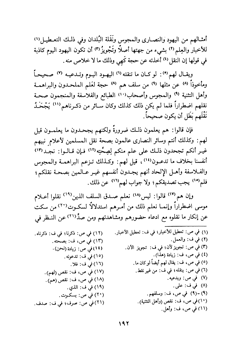 وَيُقَال لَهُم لَو كَانَ مَا تنقله الْيَهُود الْيَوْم وتدعيه صَحِيحا ومأخوذا عَن مثلهَا من سلف هم حجَّة لعلم الْمُلْحِدُونَ والبراهمة وَأهل التَّثْنِيَة وَالْمَجُوس وَأَصْحَاب الطبائع والفلاسفة والمنجمون صِحَة نقلهم اضطرارا فَلَمَّا لم تكن ذَلِك كَذَلِك وَكَانَ سَائِر من ذَكَرْنَاهُمْ يجْحَد نقلهم بَطل أَن يكون صَحِيحا