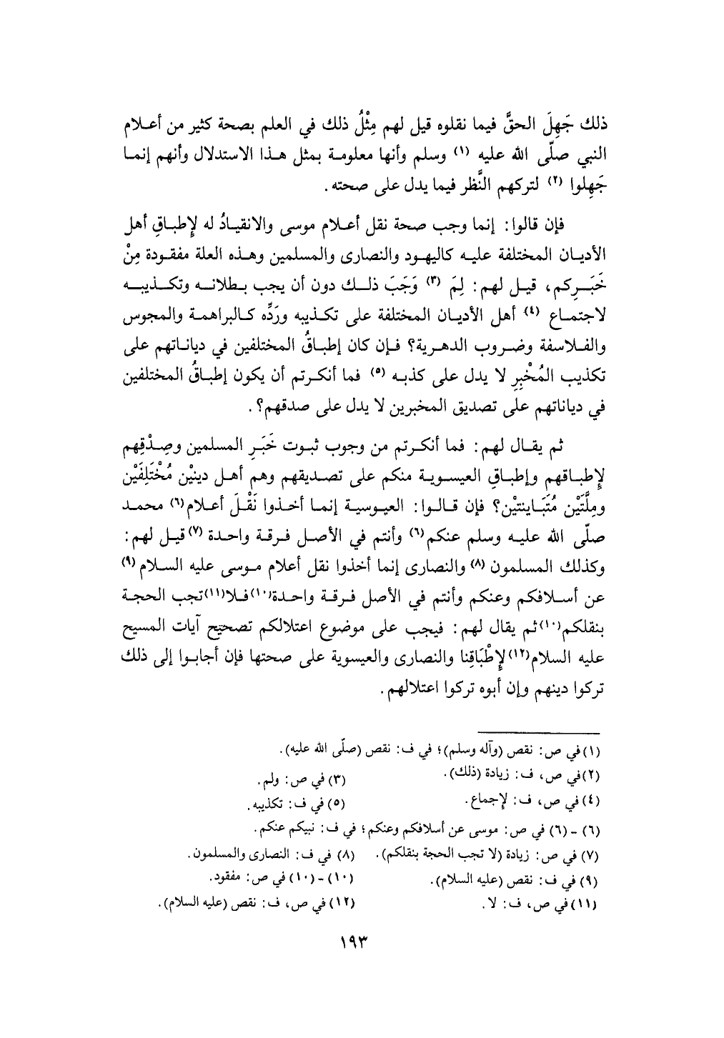 فَإِن قَالُوا إِنَّمَا وَجب صِحَة نقل أَعْلَام مُوسَى والانقياد لَهُ لإطباق أهل الْأَدْيَان الْمُخْتَلفَة عَلَيْهِ كاليهود وَالنَّصَارَى وَالْمُسْلِمين وَهَذِه الْعلَّة مفقودة من خبركم قيل لَهُم لم وَجب ذَلِك دون أَن يجب بُطْلَانه وتكذيبه لِاجْتِمَاع أهل الْأَدْيَان الْمُخْتَلفَة على تَكْذِيبه ورده كالبراهمة وَالْمَجُوس والفلاسفة وضروب الدهرية فَإِن كَانَ إطباق الْمُخْتَلِفين فِي دياناتهم على تَكْذِيب الْمخبر لَا يدل على كذبه فَمَا أنكرتم أَن يكون إطباق الْمُخْتَلِفين فِي دياناتهم على تَصْدِيق المخبرين لَا يدل على صدقهم