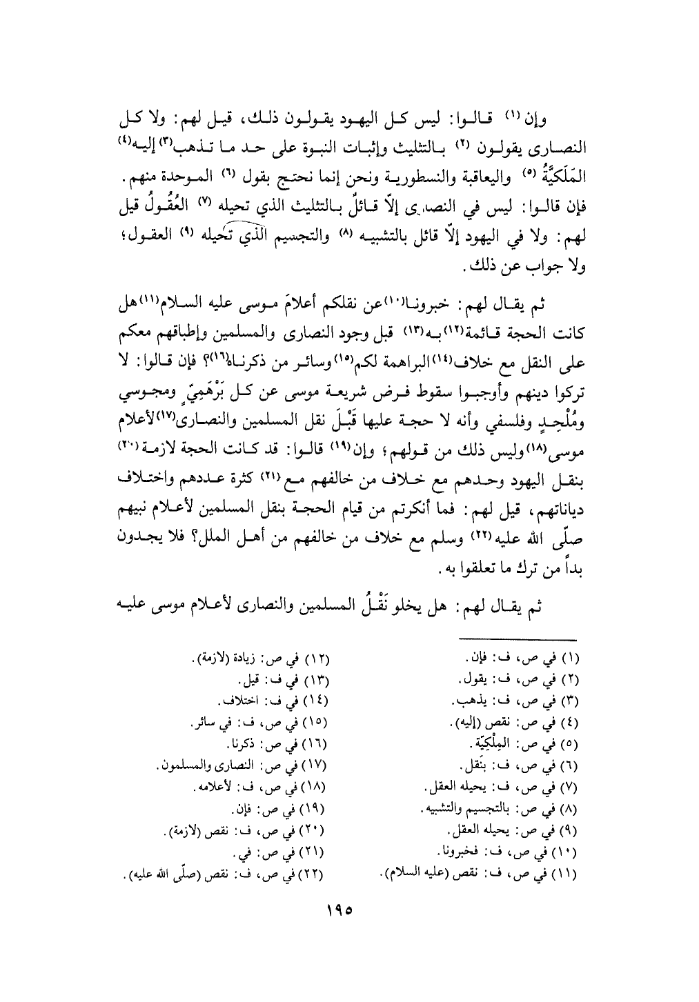 ثمَّ يُقَال لَهُم خبرونا عَن نقلكم أَعْلَام مُوسَى عَلَيْهِ السَّلَام هَل كَانَت الْحجَّة قَائِمَة بِهِ قبل وجود النَّصَارَى وَالْمُسْلِمين وإطباقهم مَعكُمْ على النَّقْل مَعَ خلاف البراهمة لكم وَسَائِر من ذَكرْنَاهُ فَإِن قَالُوا لَا تركُوا دينهم وأوجبوا سُقُوط فرض شَرِيعَة مُوسَى عَن كل برهمي ومجوسي وملحد وفلسفي وَأَنه لَا حجَّة عَلَيْهَا قبل نقل الْمُسلمين وَالنَّصَارَى لأعلام مُوسَى وَلَيْسَ ذَلِك من قَوْلهم وَإِن قَالُوا قد كَانَت الْحجَّة لَازِمَة بِنَقْل الْيَهُود وحدهم مَعَ خلاف من خالفهم مَعَ كَثْرَة عَددهمْ وَاخْتِلَاف دياناتهم قيل لَهُم فَمَا أنكرتم من قيام الْحجَّة بِنَقْل الْمُسلمين لأعلام نَبِيّهم صلى الله عَلَيْهِ وَسلم مَعَ خلاف من خالفهم من أهل الْملَل فَلَا يَجدونَ بدا من ترك مَا تعلقوا بِهِ