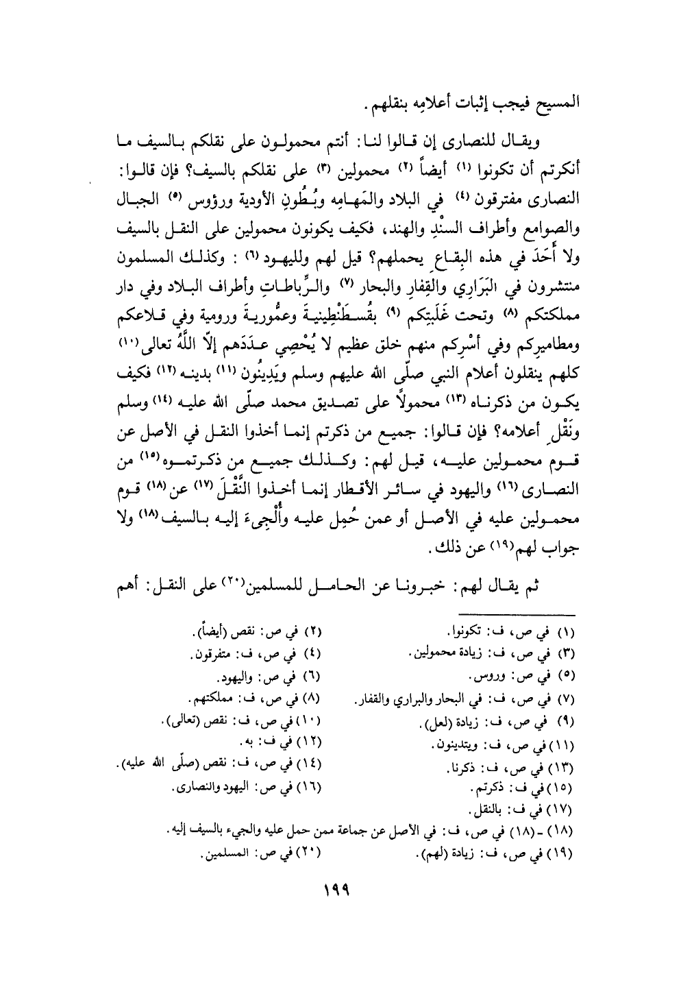 وَيُقَال لِلنَّصَارَى إِن قَالُوا لنا أَنْتُم محمولون على نقلكم بِالسَّيْفِ مَا أنكرتم أَن تَكُونُوا أَيْضا محمولين على نقلكم بِالسَّيْفِ فَإِن قَالُوا النَّصَارَى مفترقون فِي الْبِلَاد والمهامة وبطون الأودية ورؤوس الْجبَال والصوامع وأطراف السَّنَد والهند فَكيف يكونُونَ محمولين على النَّقْل بِالسَّيْفِ وَلَا أحد فِي هَذِه الْبِقَاع يحملهم قيل لَهُم ولليهود وَكَذَلِكَ الْمُسلمُونَ منتشرون فِي البراري والقفار والبحار والرباطات وأطراف الْبِلَاد وَفِي دَار مملكتكم وَتَحْت غلبتكم بقسطنطينية وعمورية ورومية وَفِي قلاعكم ومطاميركم وَفِي أسركم مِنْهُم خلق عَظِيم لَا يحصي عَددهمْ إِلَّا الله تَعَالَى كلهم ينقلون أَعْلَام النَّبِي صلى الله عَلَيْهِ وَسلم ويدينون بِدِينِهِ فَكيف يكون من ذَكرْنَاهُ مَحْمُولا على تَصْدِيق مُحَمَّد صلى الله عَلَيْهِ وَسلم وَنقل أَعْلَامه فَإِن قَالُوا جَمِيع من ذكرْتُمْ إِنَّمَا أخذُوا النَّقْل فِي الأَصْل عَن قوم محمولين عَلَيْهِ قيل لَهُم وَكَذَلِكَ جَمِيع من ذكرتموه من النَّصَارَى وَالْيَهُود فِي سَائِر الأقطار إِنَّمَا أخذُوا النَّقْل عَن قوم محمولين عَلَيْهِ فِي الأَصْل أَو عَمَّن حمل عَلَيْهِ وألجىء إِلَيْهِ بِالسَّيْفِ وَلَا جَوَاب لَهُم عَن ذَلِك