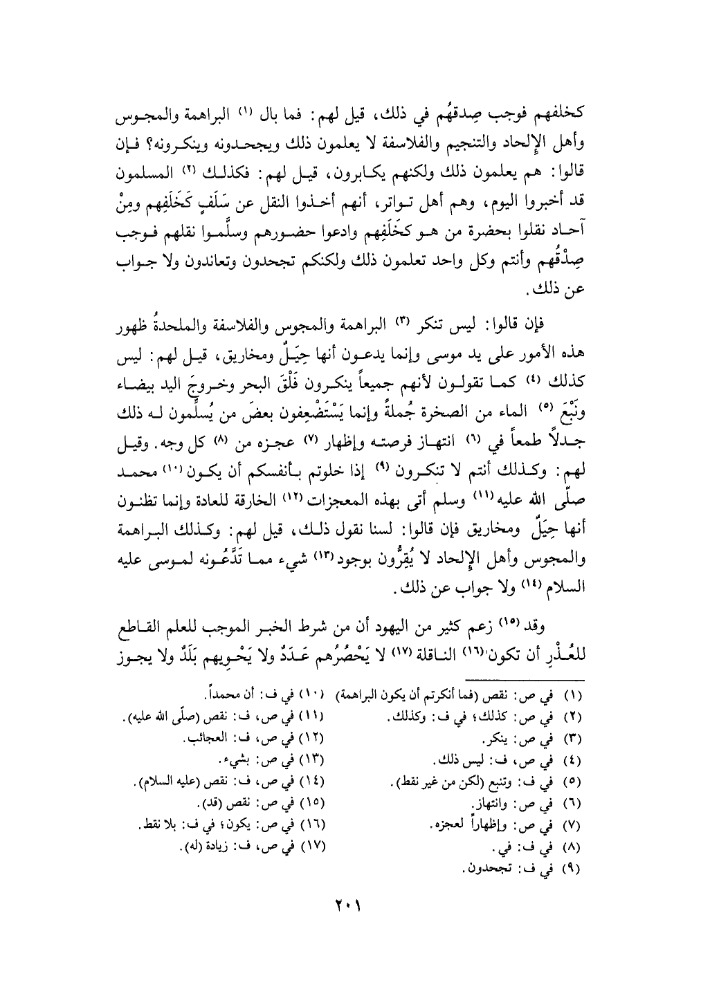 وَقيل لَهُم وَكَذَلِكَ أَنْتُم لَا تنكرون إِذا خلوتم بِأَنْفُسِكُمْ أَن يكون مُحَمَّد صلى الله عَلَيْهِ وَسلم أَتَى بِهَذِهِ المعجزات الخارقة للْعَادَة وَإِنَّمَا تظنون أَنَّهَا حيل ومخاريق فَإِن قَالُوا لسنا نقُول ذَلِك قيل لَهُم وَكَذَلِكَ البراهمة وَالْمَجُوس وَأهل الْإِلْحَاد لَا يقرونَ بِوُجُود شَيْء مِمَّا تَدعُونَهُ لمُوسَى عَلَيْهِ السَّلَام وَلَا جَوَاب عَن ذَلِك