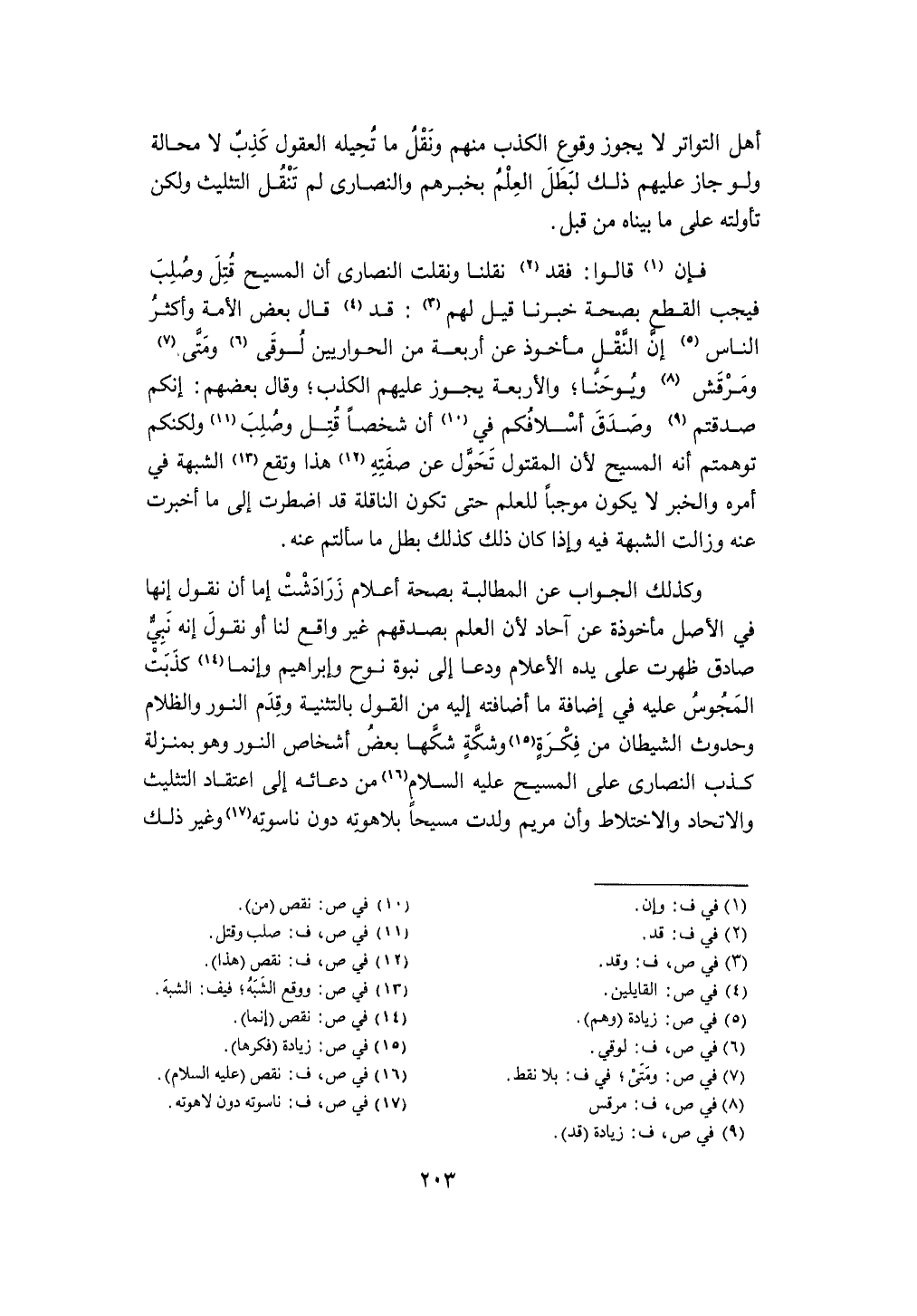 فَإِن قَالُوا فقد نقلنا ونقلت النَّصَارَى أَن الْمَسِيح قتل وصلب فَيجب الْقطع بِصِحَّة خبرنَا قيل لَهُم قد قَالَ بعض الْأمة وَأكْثر النَّاس إِن النَّقْل مَأْخُوذ عَن أَرْبَعَة من الحواريين لوقى وَمَتى ومرقش ويوحنا وَالْأَرْبَعَة يجوز عَلَيْهِم الْكَذِب وَقَالَ بَعضهم إِنَّكُم صَدقْتُمْ وَصدق أسلافكم فِي أَن شخصا قتل وصلب وَلَكِنَّكُمْ توهمتم أَنه الْمَسِيح لِأَن الْمَقْتُول تحول عَن صفته هَذَا وَتَقَع الشُّبْهَة فِي أمره وَالْخَبَر لَا يكون مُوجبا للْعلم حَتَّى تكون الناقلة قد اضطرت إِلَى مَا أخْبرت عَنهُ وزالت الشُّبْهَة فِيهِ وَإِذا كَانَ ذَلِك كَذَلِك بَطل مَا سَأَلْتُم عَنهُ