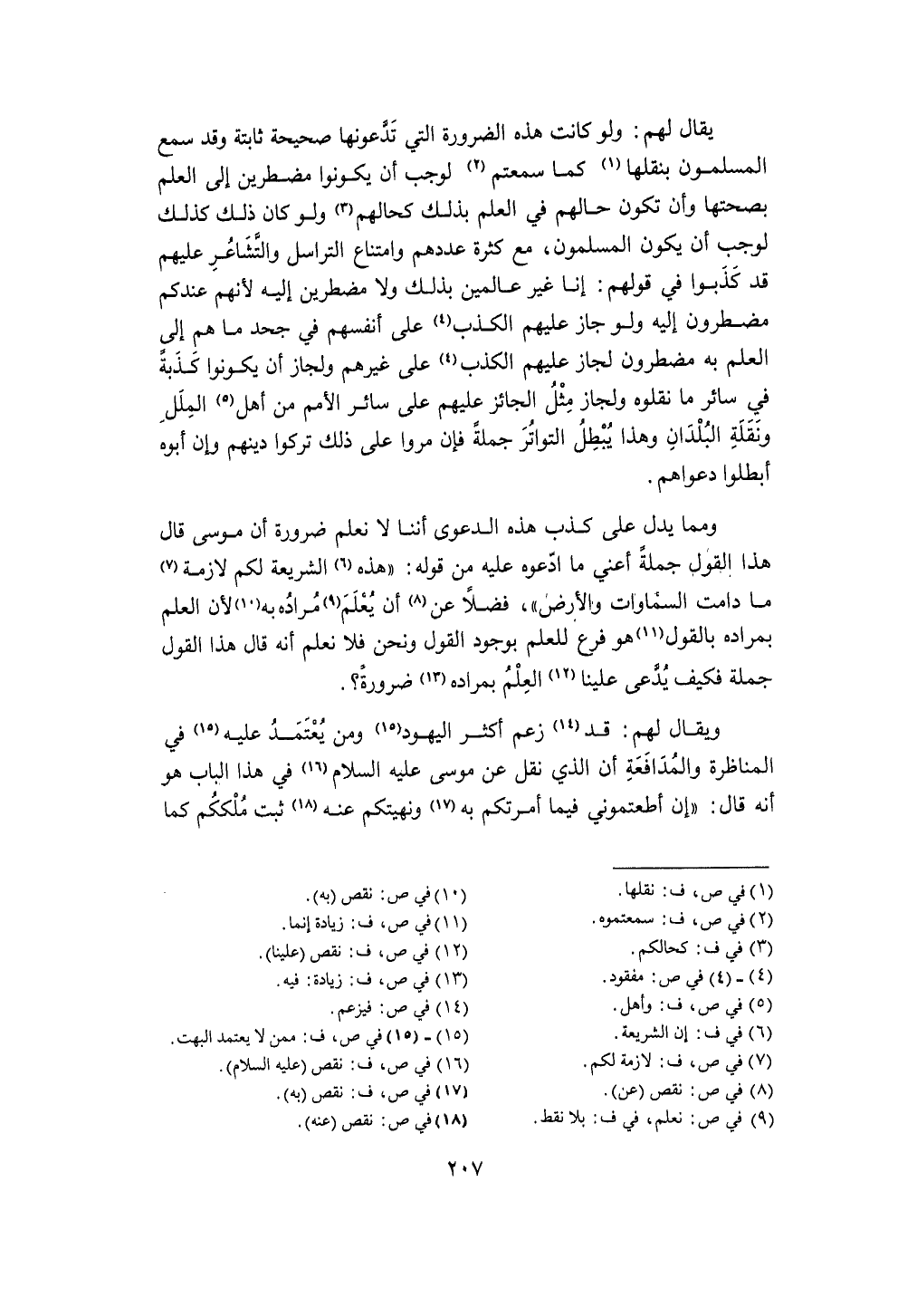 وَمِمَّا يدل على كذب هَذِه الدَّعْوَى أننا لَا نعلم ضَرُورَة أَن مُوسَى قَالَ هَذَا القَوْل جملَة أَعنِي مَا ادعوهُ عَلَيْهِ من قَوْله هَذِه الشَّرِيعَة لكم لَازِمَة مَا دَامَت السَّمَاوَات وَالْأَرْض فضلا عَن أَن يعلم مُرَاده بِهِ لِأَن الْعلم بمراده بالْقَوْل هُوَ فرع للْعلم بِوُجُود القَوْل وَنحن فَلَا نعلم أَنه قَالَ هَذَا القَوْل جملَة فَكيف يدعى علينا الْعلم بمراده ضَرُورَة
