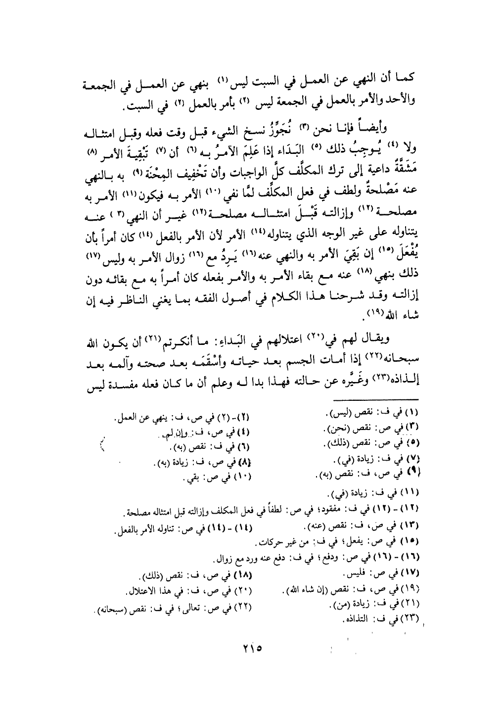 وَأَيْضًا فَإنَّا نَحن نجوز نسخ الشَّيْء قبل وَقت فعله وَقبل امتثاله وَلَا يُوجب ذَلِك البداء إِذا علم الْآمِر بِهِ أَن تبقية الْأَمر مشقة دَاعِيَة إِلَى ترك الْمُكَلف كل الْوَاجِبَات وَأَن تَخْفيف المحنة بِهِ بِالنَّهْي عَنهُ مصلحَة ولطف فِي فعل الْمُكَلف لما نفي الْأَمر بِهِ فَيكون الْأَمر بِهِ مصلحَة وإزالته قبل امتثاله مصلحَة غير أَن النَّهْي عَنهُ يتَنَاوَلهُ على غير الْوَجْه الَّذِي يتَنَاوَلهُ الْأَمر لِأَن الْأَمر بِالْفِعْلِ كَانَ أمرا بِأَن يفعل إِن بَقِي الْأَمر بِهِ وَالنَّهْي عَنهُ يرد مَعَ زَوَال الْأَمر بِهِ وَلَيْسَ ذَلِك بنهي عَنهُ مَعَ بَقَاء الْأَمر بِهِ وَالْأَمر بِفِعْلِهِ كَانَ أمرا بِهِ مَعَ بَقَائِهِ دون إِزَالَته وَقد شرحنا هَذَا الْكَلَام فِي أصُول الْفِقْه بِمَا يُغني النَّاظر فِيهِ إِن شَاءَ الله