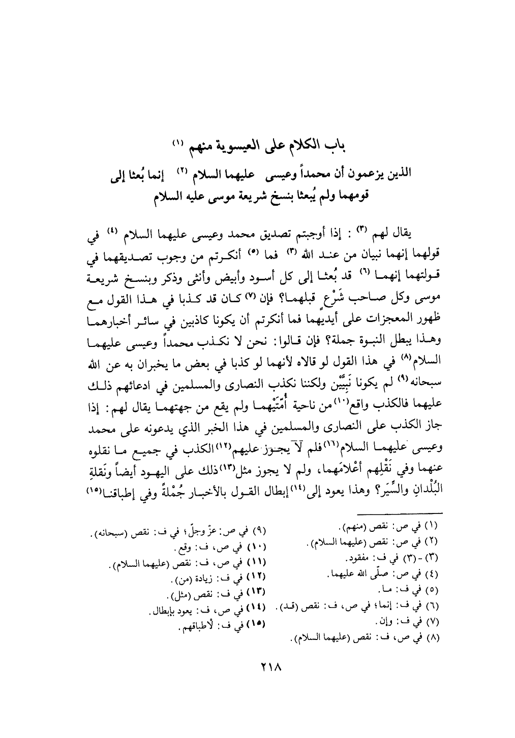 بَاب الْكَلَام على العيسوية مِنْهُم الَّذين يَزْعمُونَ أَن مُحَمَّدًا وَعِيسَى عَلَيْهِمَا السَّلَام إِنَّمَا بعثا إِلَى قومهما وَلم يبعثا بنسخ شَرِيعَة مُوسَى عَلَيْهِ السَّلَام