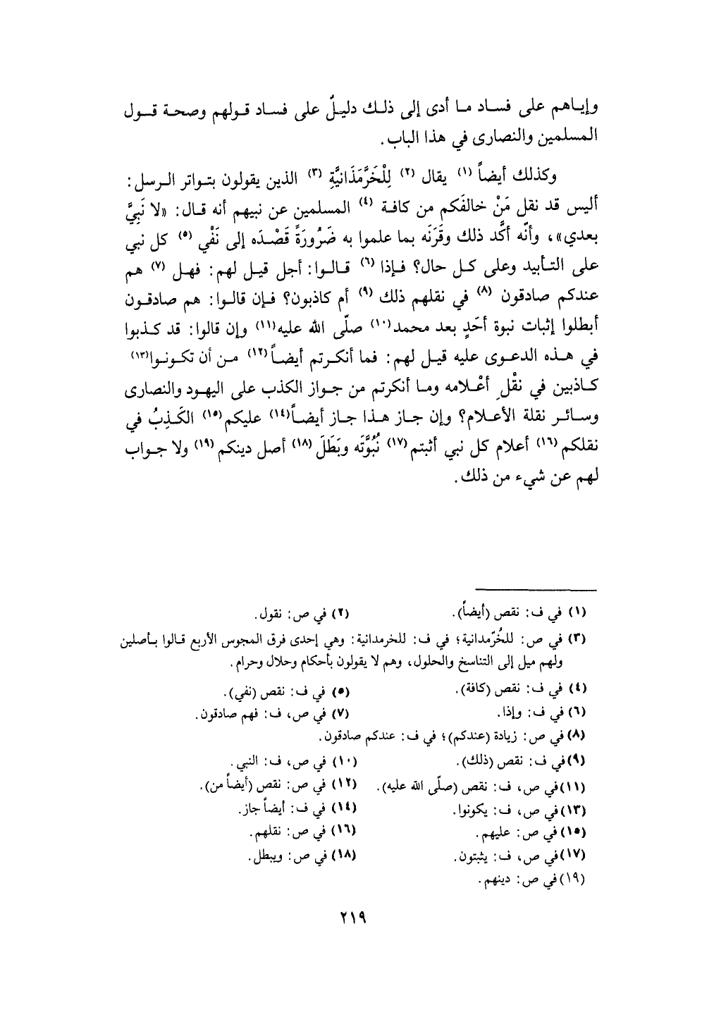 وَكَذَلِكَ أَيْضا يُقَال للخرمذانية الَّذين يَقُولُونَ بتواتر الرُّسُل أَلَيْسَ قد نقل من خالفكم من كَافَّة الْمُسلمين عَن نَبِيّهم أَنه قَالَ (لَا نَبِي بعدِي) وَأَنه أكد ذَلِك وقرنه بِمَا علمُوا بِهِ ضَرُورَة قَصده إِلَى نفي كل نَبِي على التَّأْبِيد وعَلى كل حَال فَإِذا قَالُوا أجل قيل لَهُم فَهَل هم عنْدكُمْ صَادِقُونَ فِي نقلهم ذَلِك أم كاذبون فَإِن قَالُوا هم صَادِقُونَ أبطلوا إِثْبَات نبوة أحد بعد مُحَمَّد صلى الله عَلَيْهِ وَسلم وَإِن قَالُوا قد كذبُوا فِي هَذِه الدَّعْوَى عَلَيْهِ قيل لَهُم فَمَا أنكرتم أَيْضا من أَن تَكُونُوا كاذبين فِي نقل أَعْلَامه وَمَا أنكرتم من جَوَاز الْكَذِب على الْيَهُود وَالنَّصَارَى وَسَائِر نقلة الْأَعْلَام وَإِن جَازَ هَذَا جَازَ أَيْضا عَلَيْكُم الْكَذِب فِي نقلكم أَعْلَام كل نَبِي أثبتم نبوته وَبَطل أصل دينكُمْ وَلَا جَوَاب لَهُم عَن شَيْء من ذَلِك