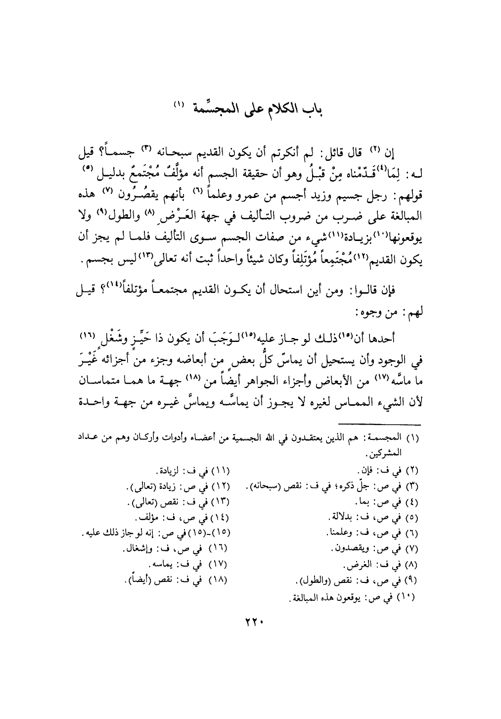إِن قَالَ قَائِل لم أنكرتم أَن يكون الْقَدِيم سُبْحَانَهُ جسما قيل لَهُ لما قدمْنَاهُ من قبل وَهُوَ أَن حَقِيقَة الْجِسْم أَنه مؤلف مُجْتَمع بِدَلِيل قَوْلهم رجل جسيم وَزيد أجسم من عَمْرو وعلما بِأَنَّهُم يقصرون هَذِه الْمُبَالغَة على ضرب من ضروب التَّأْلِيف فِي جِهَة الْعرض والطول وَلَا يوقعونها بِزِيَادَة شَيْء من صِفَات الْجِسْم سوى التَّأْلِيف فَلَمَّا لم يجز أَن يكون الْقَدِيم مجتمعا مؤتلفا وَكَانَ شَيْئا وَاحِدًا ثَبت أَنه تَعَالَى لَيْسَ بجسم