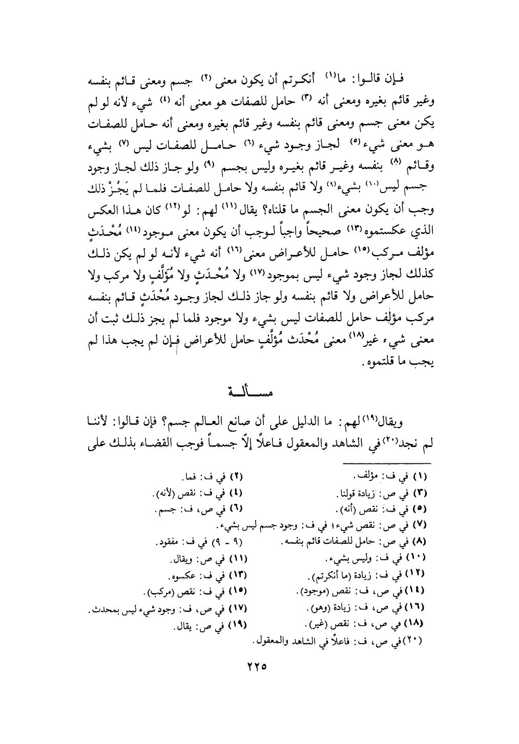 فَإِن قَالُوا مَا أنكرتم أَن يكون معنى جسم وَمعنى قَائِم بِنَفسِهِ وَغير قَائِم بِغَيْرِهِ وَمعنى أَنه حَامِل للصفات هُوَ معنى أَنه شَيْء لِأَنَّهُ لَو لم يكن معنى جسم وَمعنى قَائِم بِنَفسِهِ وَغير قَائِم بِغَيْرِهِ وَمعنى أَنه حَامِل للصفات هُوَ معنى شَيْء لجَاز وجود شَيْء حَامِل للصفات لَيْسَ بِشَيْء وقائم بِنَفسِهِ وَغير قَائِم بِغَيْرِهِ وَلَيْسَ بجسم وَلَو جَازَ ذَلِك لجَاز وجود جسم لَيْسَ بِشَيْء وَلَا قَائِم بِنَفسِهِ وَلَا حَامِل للصفات فَلَمَّا لم يجز ذَلِك وَجب أَن يكون معنى الْجِسْم مَا قُلْنَاهُ يُقَال لَهُم لَو كَانَ هَذَا الْعَكْس الَّذِي عكستموه صَحِيحا وَاجِبا لوَجَبَ أَن يكون معنى مَوْجُود مُحدث مؤلف مركب حَامِل للأغراض معنى لِأَنَّهُ لَو لم يكن ذَلِك كَذَلِك لجَاز وجود شَيْء لَيْسَ بموجود وَلَا مُحدث وَلَا مؤلف وَلَا مركب وَلَا حَامِل للأعراض وَلَا قَائِم بِنَفسِهِ وَلَو جَازَ ذَلِك لجَاز وجود مُحدث قَائِم بِنَفسِهِ مركب مؤلف حَامِل للصفات لَيْسَ بِشَيْء وَلَا مَوْجُود فَلَمَّا لم يجز ذَلِك ثَبت أَن معنى شَيْء غير معنى مُحدث مؤلف حَامِل للأعراض فَإِن لم يجب هَذَا لم يجب مَا قلتموه
