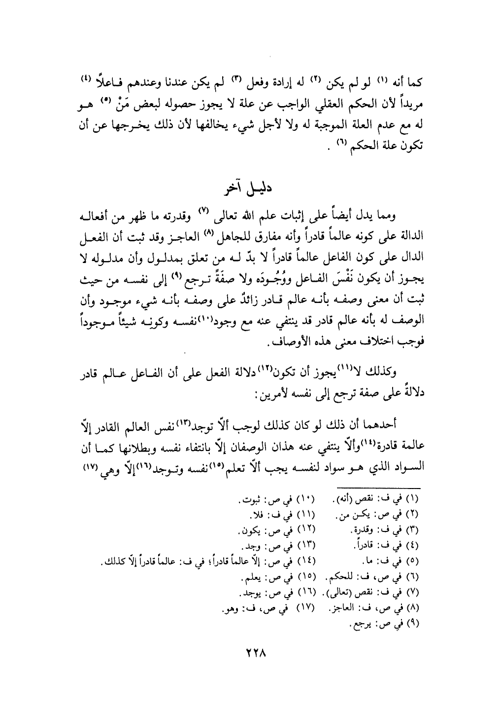 وَكَذَلِكَ لَا يجوز أَن تكون دلَالَة الْفِعْل على أَن الْفَاعِل عَالم قَادر دلَالَة على صفة ترجع إِلَى نَفسه لأمرين أَحدهمَا أَن ذَلِك لَو كَانَ كَذَلِك لوَجَبَ أَلا تُوجد نفس الْعَالم الْقَادِر إِلَّا عَالِمَة قادرة وَألا يَنْتَفِي عَنهُ هَذَانِ الوصفان إِلَّا بِانْتِفَاء نَفسه وبطلانها كَمَا أَن السوَاد الَّذِي هُوَ سَواد لنَفسِهِ يجب أَلا تعلم نَفسه وتوجد إِلَّا وَهِي