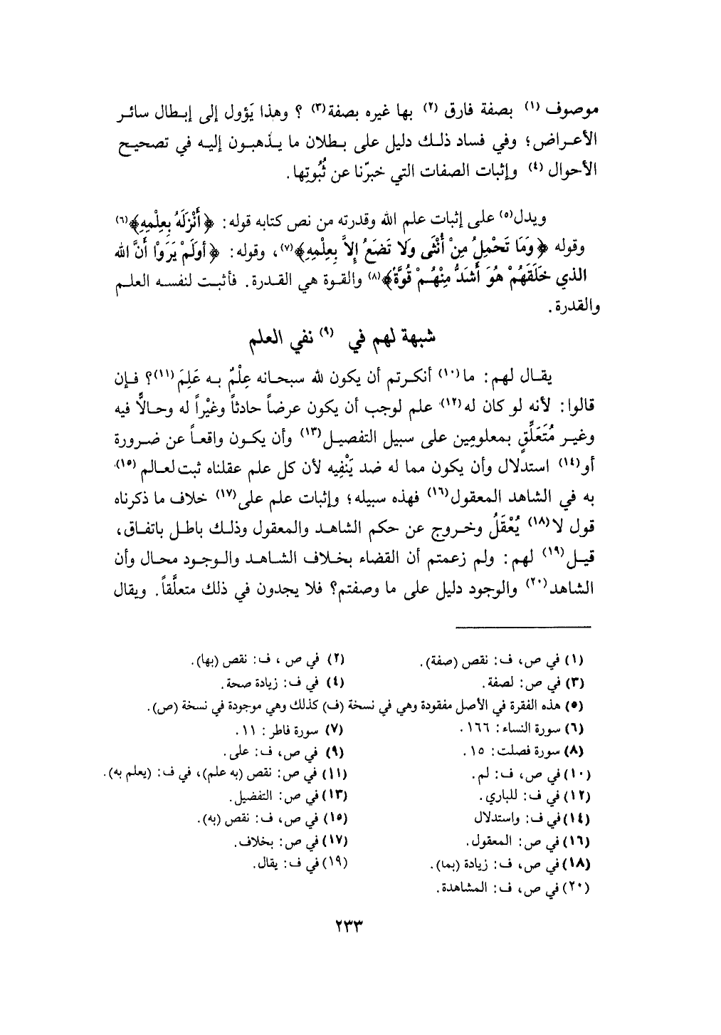 وَيدل على إِثْبَات علم الله وَقدرته من نَص كِتَابه قَوْله {أنزلهُ بِعِلْمِهِ} وَقَوله {وَمَا تحمل من أُنْثَى وَلَا تضع إِلَّا بِعِلْمِهِ} وَقَوله {أولم يرَوا أَن الله الَّذِي خلقهمْ هُوَ أَشد مِنْهُم قُوَّة} وَالْقُوَّة هِيَ الْقُدْرَة فَأثْبت لنَفسِهِ الْعلم وَالْقُدْرَة