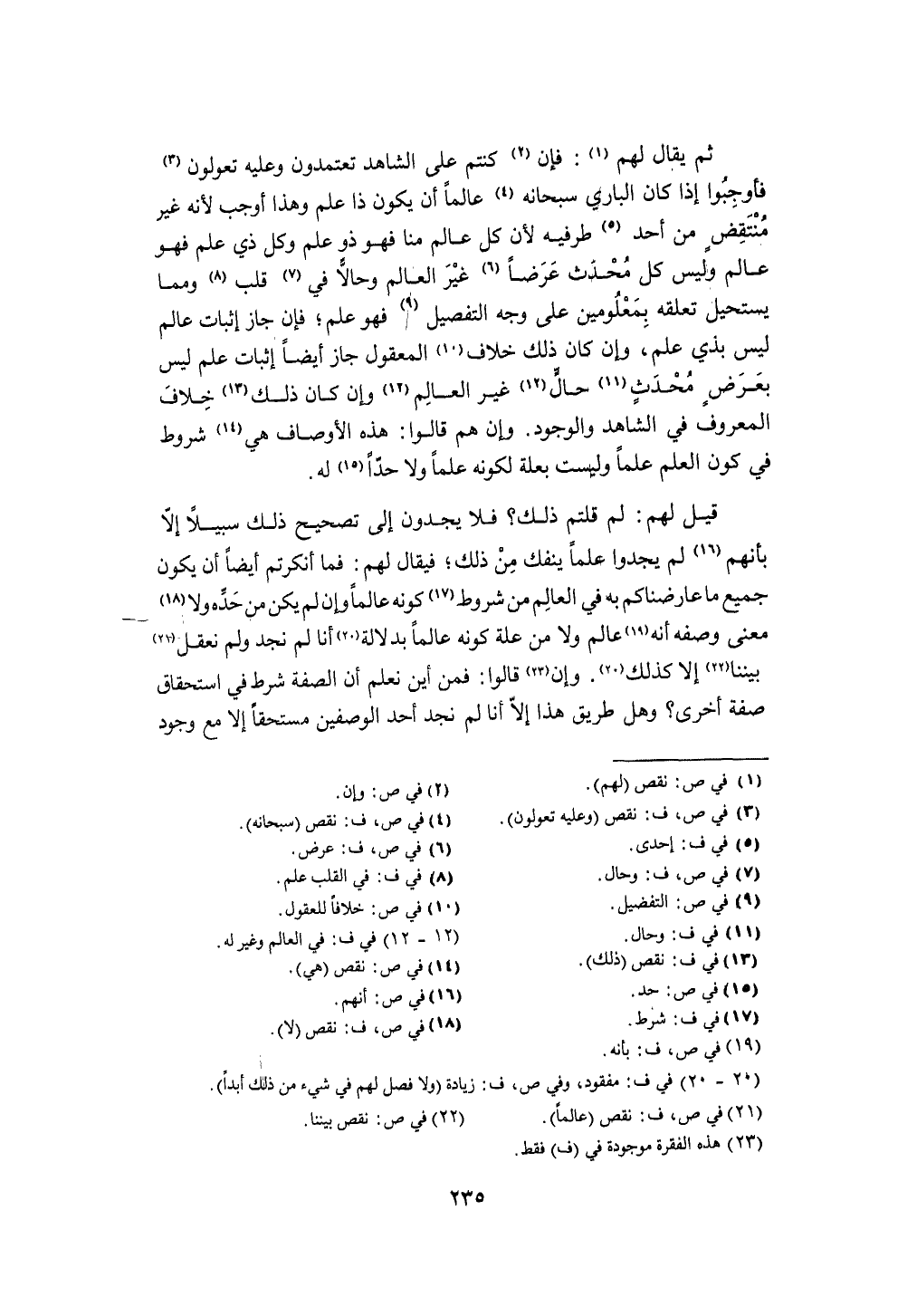 ثمَّ يُقَال لَهُم فَإِن كُنْتُم على الشَّاهِد تعتمدون وَعَلِيهِ تعولون فأوجبوا إِذا كَانَ الْبَارِي سُبْحَانَهُ عَالما أَن يكون ذَا علم وَهَذَا أوجب لِأَنَّهُ غير منتقض من أحد طَرفَيْهِ لِأَن كل عَالم منا فَهُوَ ذُو علم وكل ذِي علم فَهُوَ عَالم وَلَيْسَ كل مُحدث عرضا غير الْعَالم وَحَالا فِي قلب وَمِمَّا يَسْتَحِيل تعلقه بمعلومين على وَجه التَّفْصِيل فَهُوَ علم فَإِن جَازَ إِثْبَات عَالم لَيْسَ بِذِي علم وَإِن كَانَ ذَلِك خلاف الْمَعْقُول جَازَ أَيْضا إِثْبَات علم لَيْسَ بِعرْض مُحدث حَال غير الْعَالم وَإِن كَانَ ذَلِك خلاف الْمَعْرُوف فِي الشَّاهِد والوجود