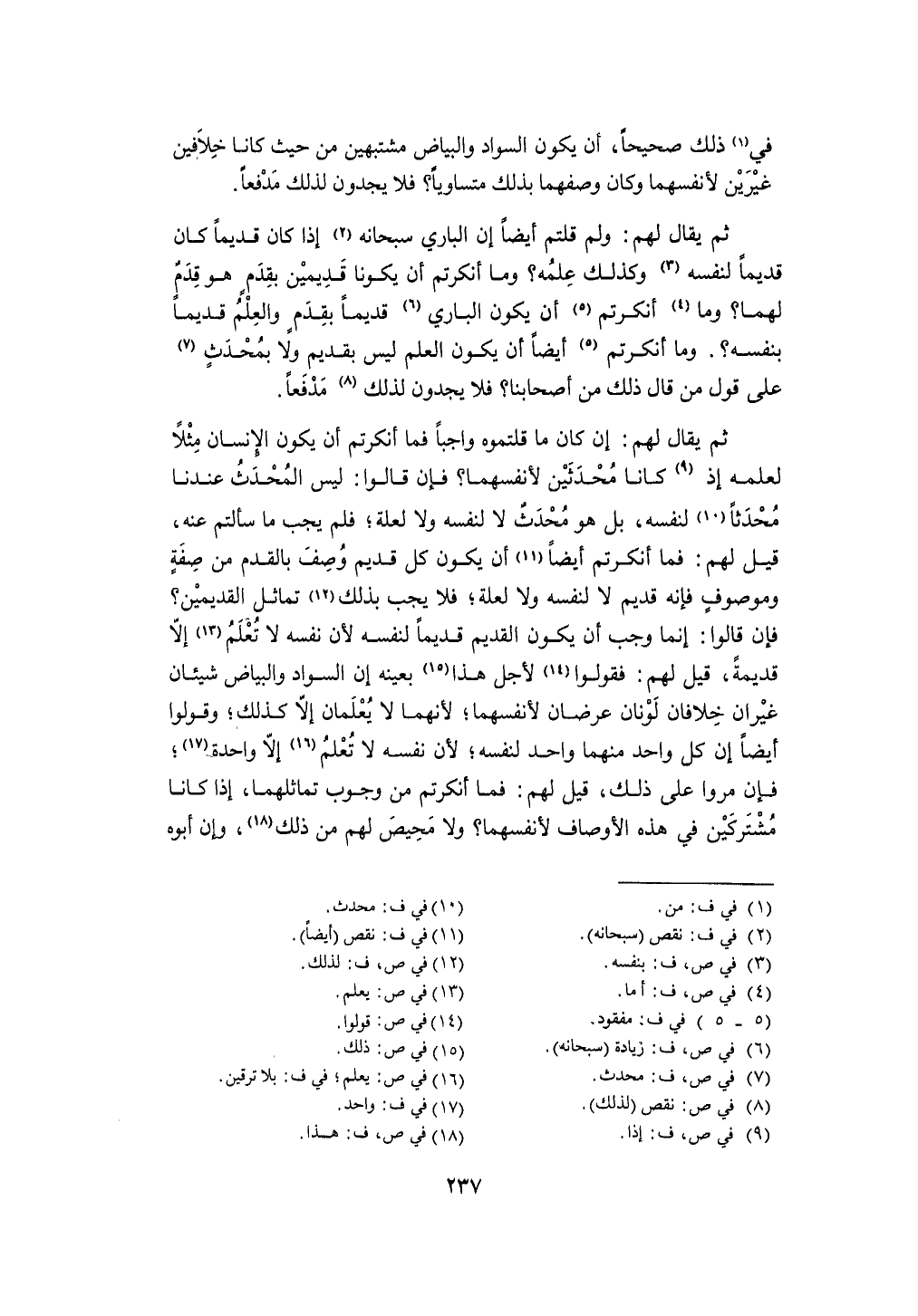 ثمَّ يُقَال لَهُم إِن كَانَ مَا قلتموه وَاجِبا فَمَا أنكرتم أَن يكون الْإِنْسَان مثلا لعلمه إِذْ كَانَا محدثين لأنفسهما فَإِن قَالُوا لَيْسَ الْمُحدث عندنَا مُحدثا لنَفسِهِ بل هُوَ مُحدث لَا لنَفسِهِ وَلَا لعِلَّة فَلم يجب مَا سَأَلْتُم عَنهُ قيل لَهُم فَمَا أنكرتم أَيْضا أَن يكون كل قديم وصف بالقدم من صفة وموصوف فَإِنَّهُ قديم لَا لنَفسِهِ وَلَا لعِلَّة فَلَا يجب بذلك تماثل القديمين فَإِن قَالُوا إِنَّمَا وَجب أَن يكون الْقَدِيم قَدِيما لنَفسِهِ لِأَن نَفسه لَا تعلم إِلَّا قديمَة قيل لَهُم فَقولُوا لأجل هَذَا بِعَيْنِه إِن السوَاد وَالْبَيَاض شَيْئَانِ غيران خلافان لونان عرضان لأنفسهما لِأَنَّهُمَا لَا يعلمَانِ إِلَّا كَذَلِك وَقُولُوا أَيْضا إِن كل وَاحِد مِنْهُمَا وَاحِد لنَفسِهِ لِأَن نَفسه لَا تعلم إِلَّا وَاحِدَة فَإِن مروا على ذَلِك قيل لَهُم فَمَا أنكرتم من وجوب تماثلهما إِذا كَانَا مشتركين فِي هَذِه الْأَوْصَاف لأنفسهما وَلَا محيص لَهُم من ذَلِك وَإِن أَبوهُ