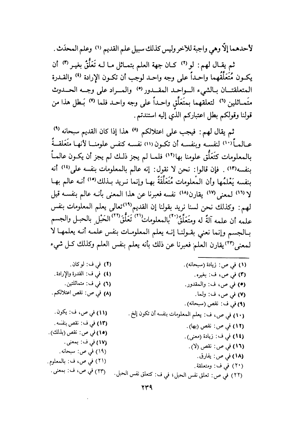 ثمَّ يُقَال لَهُم فَيجب على اعتلالكم هَذَا إِذا كَانَ الْقَدِيم سُبْحَانَهُ عَالما لنَفسِهِ وبنفسه أَن تكون نَفسه كَنَفس علومنا لِأَنَّهَا مُتَعَلقَة بالمعلومات كتعلق علومنا بهَا فَلَمَّا لم يجز ذَلِك لم يجز أَن يكون عَالما بِنَفسِهِ