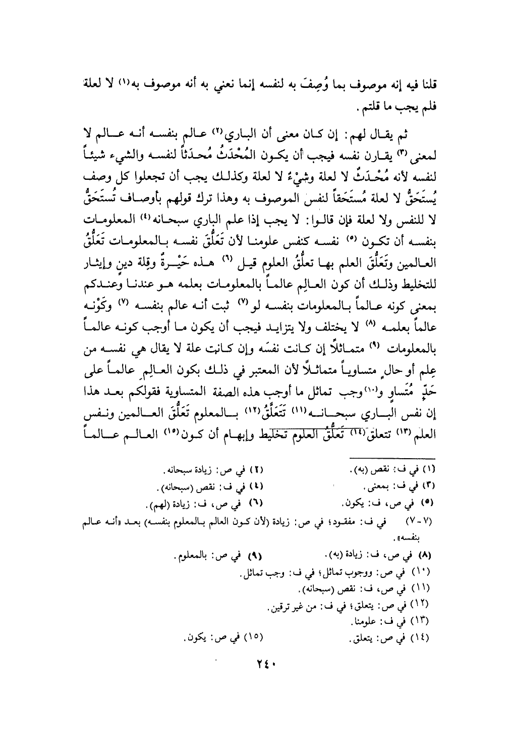 ثمَّ يُقَال لَهُم إِن كَانَ معنى أَن الْبَارِي عَالم بِنَفسِهِ أَنه عَالم لَا لِمَعْنى يقارن نَفسه فَيجب أَن يكون الْمُحدث مُحدثا لنَفسِهِ وَالشَّيْء شَيْئا لنَفسِهِ لِأَنَّهُ مُحدث لَا لعِلَّة وَشَيْء لَا لعِلَّة وَكَذَلِكَ يجب أَن تجْعَلُوا كل وصف يسْتَحق لَا لعِلَّة مُسْتَحقّا لنَفس الْمَوْصُوف بِهِ وَهَذَا ترك قَوْلهم بأوصاف تسْتَحقّ لَا للنَّفس وَلَا لعِلَّة فَإِن قَالُوا لَا يجب إِذا علم الْبَارِي سُبْحَانَهُ المعلومات بِنَفسِهِ أَن تكون نَفسه كَنَفس علومنا لِأَن تعلق نَفسه بالمعلومات تعلق الْعَالمين وَتعلق الْعلم بهَا تعلق الْعُلُوم قيل هَذِه حيرة وَقلة دين وإيثار للتخليط وَذَلِكَ أَن كَون الْعَالم عَالما بالمعلومات بِعِلْمِهِ هُوَ عندنَا وعندكم بِمَعْنى كَونه عَالما بالمعلومات بِنَفسِهِ لَو ثَبت أَنه عَالم بِنَفسِهِ وَكَونه عَالما بِعِلْمِهِ لَا يخْتَلف وَلَا يتزايد فَيجب أَن يكون مَا أوجب كَونه عَالما علم أَو حَال مُتَسَاوِيا متماثلا لِأَن الْمُعْتَبر فِي ذَلِك بِكَوْن الْعَالم عَالما على حد متساو وَجب تماثل مَا أوجب هَذِه الصّفة المتساوية فقولكم بعد هَذَا إِن نفس الْبَارِي سُبْحَانَهُ تتَعَلَّق بالمعلوم تعلق الْعَالمين وَنَفس الْعلم تتَعَلَّق تعلق الْعُلُوم تَخْلِيط وإبهام أَن كَون الْعَالم عَالما