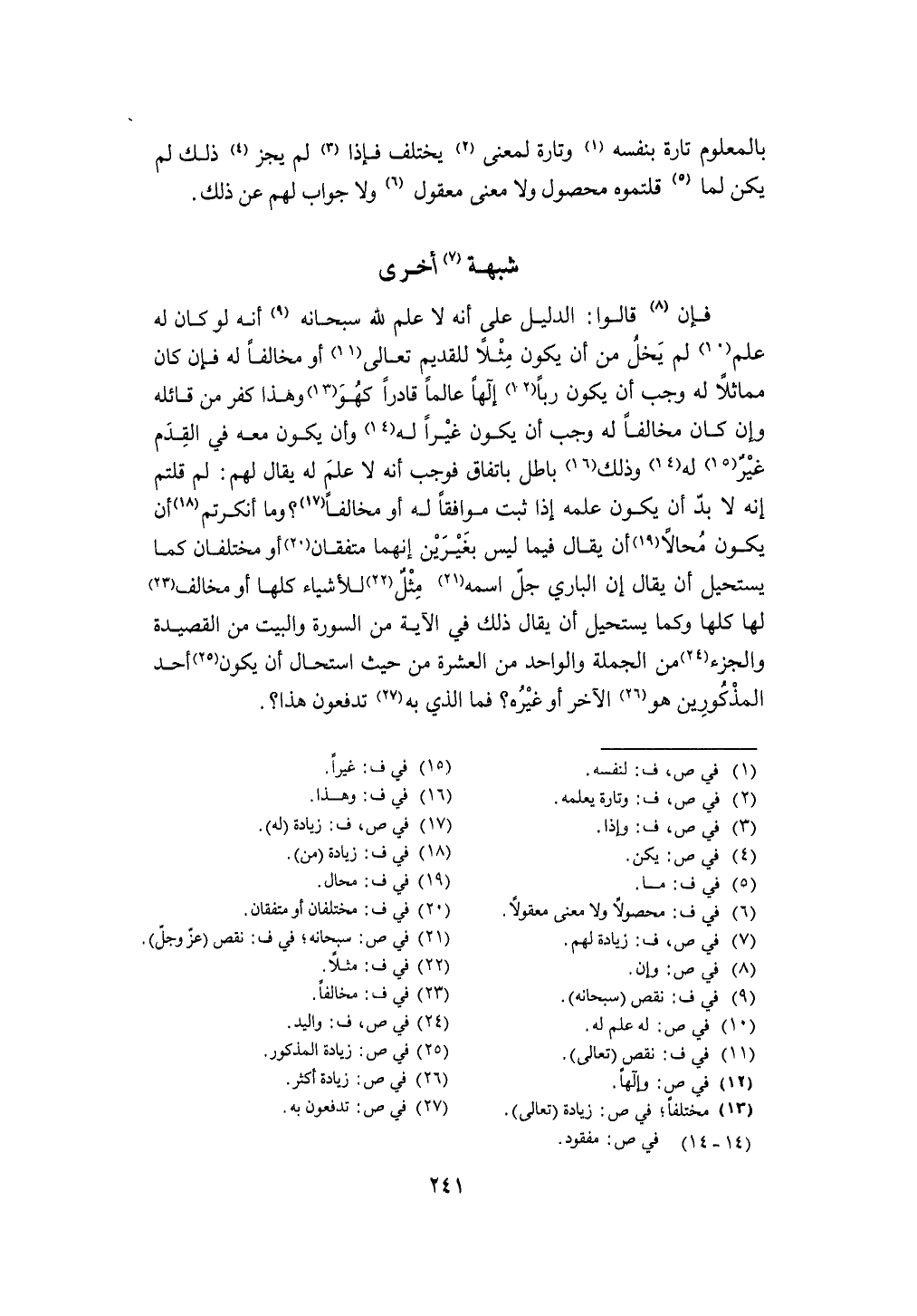 فَإِن قَالُوا الدَّلِيل على أَنه لَا علم لله سُبْحَانَهُ أَنه لَو كَانَ لَهُ علم لم يخل من أَن يكون مثلا للقديم تَعَالَى أَو مُخَالفا لَهُ فَإِن كَانَ مماثلا لَهُ وَجب أَن يكون رَبًّا إِلَهًا عَالما قَادِرًا كَهُوَ وَهَذَا كفر من قَائِله وَإِن كَانَ مُخَالفا لَهُ وَجب أَن يكون غيرا لَهُ وَأَن يكون مَعَه فِي الْقدَم غير لَهُ وَذَلِكَ بَاطِل بِاتِّفَاق فَوَجَبَ أَنه لَا علم لَهُ يُقَال لَهُم لم قُلْتُمْ إِنَّه لَا بُد أَن يكون علمه إِذا ثَبت مُوَافقا لَهُ أَو مُخَالفا وَمَا أنكرتم أَن يكون محالا أَن يُقَال فِيمَا لَيْسَ بغيرين إنَّهُمَا متفقان أَو مُخْتَلِفَانِ كَمَا يَسْتَحِيل أَن يُقَال إِن الْبَارِي جلّ اسْمه مثل للأشياء كلهَا أَو مُخَالف لَهَا كلهَا وكما يَسْتَحِيل أَن يُقَال ذَلِك فِي الْآيَة من السُّورَة وَالْبَيْت من القصيدة والجزء من الْجُمْلَة وَالْوَاحد من الْعشْرَة من حَيْثُ اسْتَحَالَ أَن يكون أحد الْمَذْكُورين هُوَ الآخر أَو غَيره فَمَا الَّذِي بِهِ تدفعون هَذَا