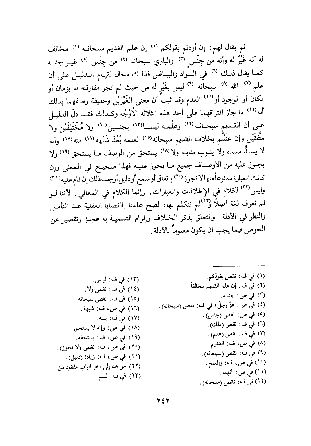 ثمَّ يُقَال لَهُم إِن أردتم بقولكم إِن علم الْقَدِيم سُبْحَانَهُ مُخَالف لَهُ أَنه غير لَهُ وَأَنه من جنس والباري سُبْحَانَهُ من جنس غير جنسه كم يُقَال ذَلِك فِي السوَاد وَالْبَيَاض فَذَلِك محَال لقِيَام الدَّلِيل على أَن علم الله سُبْحَانَهُ لَيْسَ بِغَيْر لَهُ من حَيْثُ لم تجز مُفَارقَته لَهُ بِزَمَان أَو مَكَان أَو الْوُجُود أَو الْعَدَم وَقد ثَبت أَن معنى الغيرين وَحَقِيقَة وصفهما بذلك أَنه مَا جَازَ افتراقهما على أحد هَذِه الثَّلَاثَة الْأَوْجه وَكَذَلِكَ فقد دلّ الدَّلِيل على أَن الْقَدِيم سُبْحَانَهُ وَعلمه ليسَا بجنسين وَلَا مُخْتَلفين وَلَا متفقين وَإِن عنيتم بِخِلَاف الْقَدِيم سُبْحَانَهُ لعلمه بعد شبهه مِنْهُ وَأَنه لَا يسد مسده وَلَا يَنُوب مَنَابه وَلَا يسْتَحق من الْوَصْف مَا يسْتَحق وَلَا يجوزعليه من الْأَوْصَاف جَمِيع مَا يجوز عَلَيْهِ فَهَذَا صَحِيح فِي الْمَعْنى وَإِن كَانَت الْعبارَة مَمْنُوعًا مِنْهَا لَا تجوز بِاتِّفَاق أَو سمع أَو دَلِيل أوجب ذَلِك إِن قَامَ عَلَيْهِ وَلَيْسَ الْكَلَام فِي الإطلاقات والعبارات وَإِنَّمَا الْكَلَام فِي الْمعَانِي