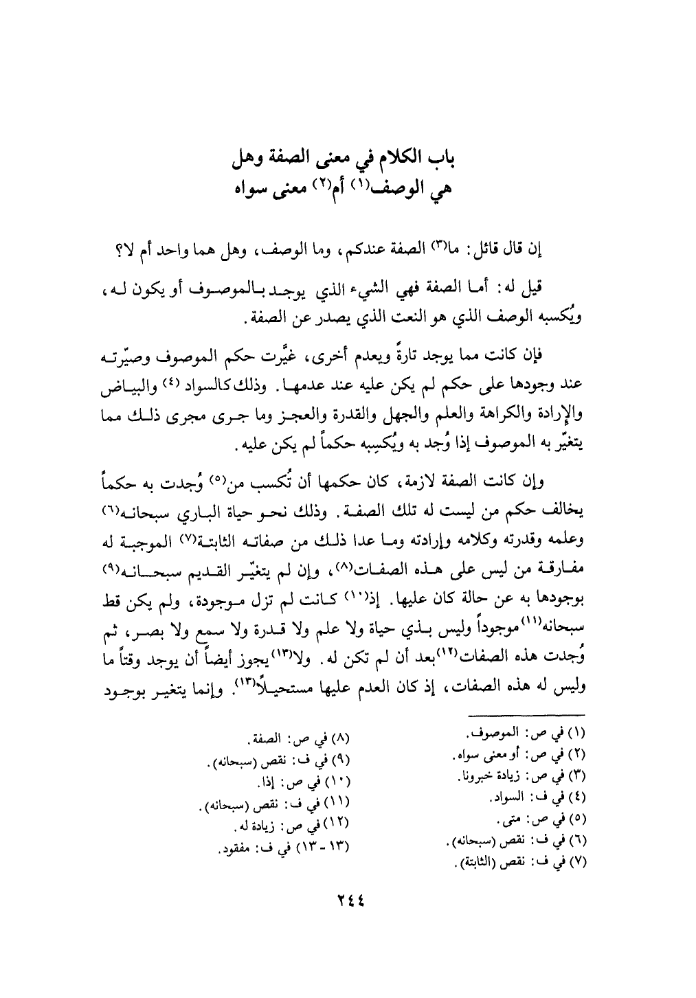 بَاب الْكَلَام فِي معنى الصّفة وَهل هِيَ الْوَصْف أم معنى سواهُ
