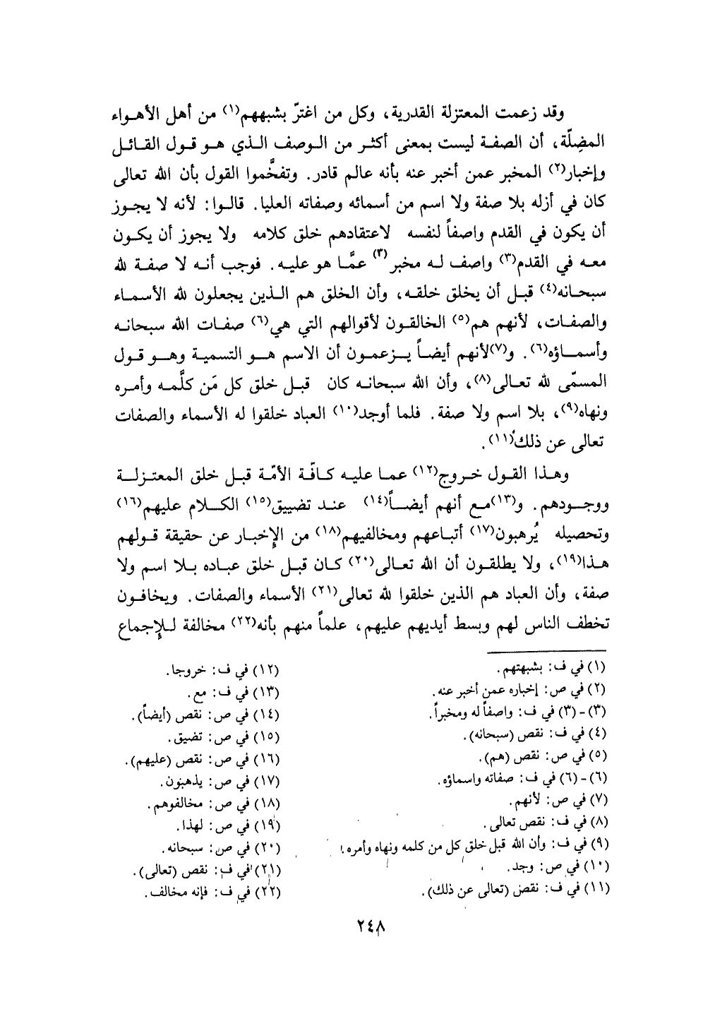 وَقد زعمت الْمُعْتَزلَة الْقَدَرِيَّة وكل من اغْترَّ بشبههم من أهل الْأَهْوَاء المضلة أَن الصّفة لَيست بِمَعْنى أَكثر من الْوَصْف الَّذِي هُوَ قَول الْقَائِل وإخبار الْمخبر عَمَّن أخبر عَنهُ بِأَنَّهُ عَالم قَادر
