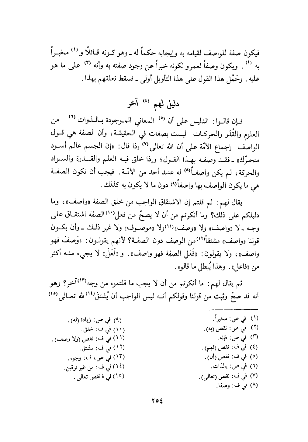 يُقَال لَهُم لم قُلْتُمْ إِن الِاشْتِقَاق الْوَاجِب من خلق الصّفة واصف وَمَا دليلكم على ذَلِك وَمَا أنكرتم من أَن لَا يَصح من فعل الصّفة اشتقاق على وَجه لَا واصف وَلَا وصف وَلَا مَوْصُوف وَلَا غير ذَلِك وَأَن يكون قَوْلنَا واصف مشتقا من الْوَصْف دون الصّفة لأَنهم يَقُولُونَ وصف فَهُوَ واصف وَلَا يَقُولُونَ فعل الصّفة فَهُوَ واصف