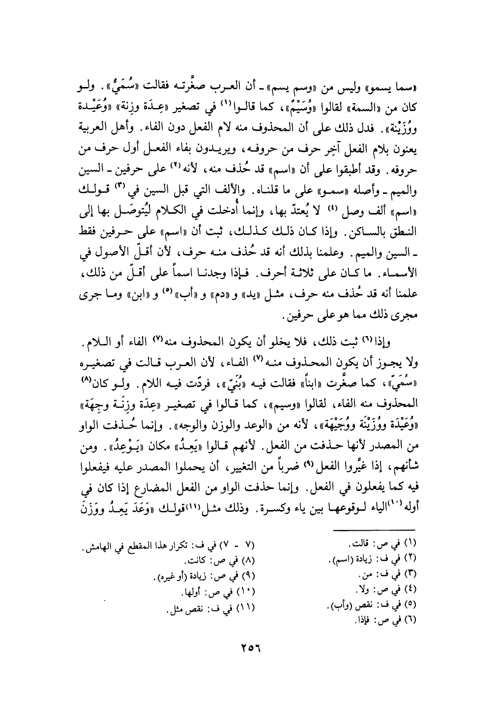 وَلَا يجوز أَن يكون الْمَحْذُوف مِنْهُ الْفَاء لِأَن الْعَرَب قَالَت فِي تصغيره سمي كَمَا صغرت ابْنا فَقَالَت فِيهِ بني فَردَّتْ مِنْهُ اللَّام