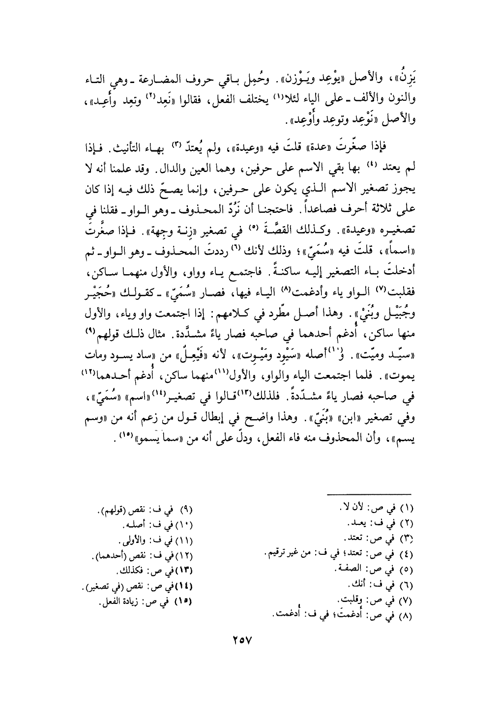 وَقد علمنَا أَنه لَا يجوز تَصْغِير الِاسْم الَّذِي يكون على حرفين وَإِنَّمَا يَصح ذَلِك فِيهِ إِذا كَانَ على ثَلَاثَة أحرف فَصَاعِدا