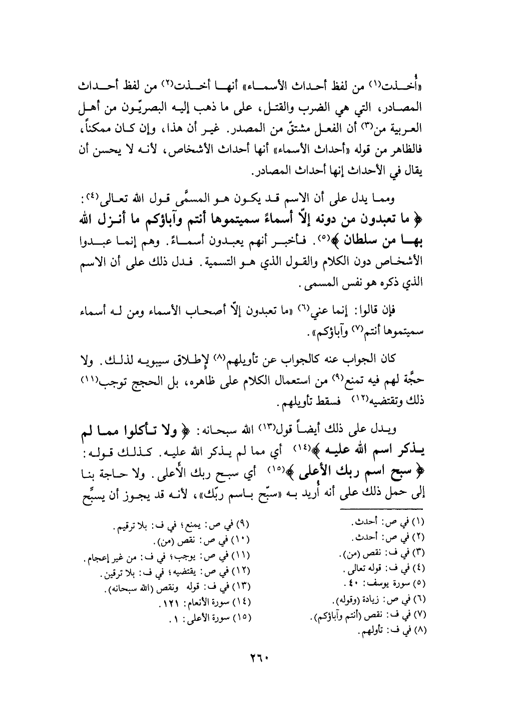 وهم إِنَّمَا عبدُوا الْأَشْخَاص دون الْكَلَام وَالْقَوْل الَّذِي هُوَ التَّسْمِيَة