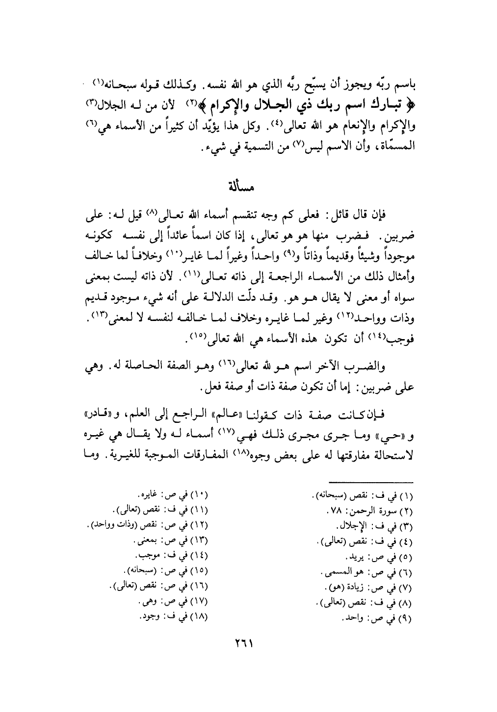 فَضرب مِنْهَا هُوَ هُوَ تَعَالَى إِذا كَانَ اسْما عَائِدًا إِلَى نَفسه كَكَوْنِهِ مَوْجُودا وشيئا وقديما وذاتا وَاحِدًا وغيرا لما غاير وَخِلَافًا لما خَالف وأمثال ذَلِك من الْأَسْمَاء الراجعة إِلَى ذَاته تَعَالَى