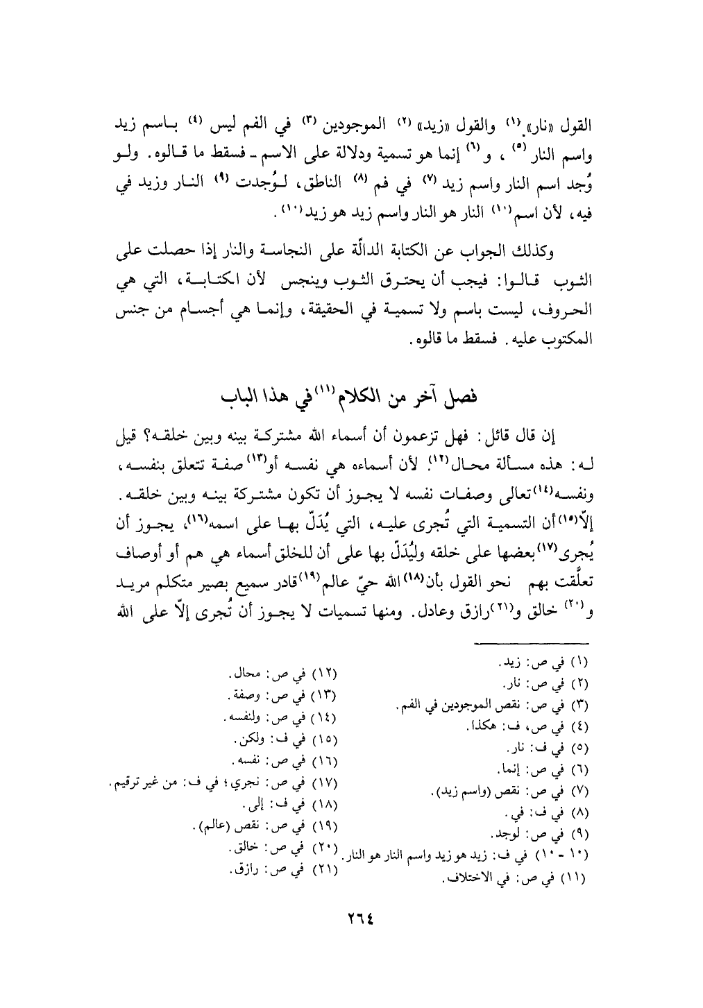 إِن قَالَ قَائِل فَهَل تَزْعُمُونَ أَن أَسمَاء الله مُشْتَركَة بَينه وَبَين خلقه قيل لَهُ هَذِه مَسْأَلَة محَال لِأَن أسماءه هِيَ نَفسه أَو صفة تتَعَلَّق بِنَفسِهِ وَنَفسه تَعَالَى وصفات نَفسه لَا يجوز أَن تكون مُشْتَركَة بَينه وَبَين خلقه