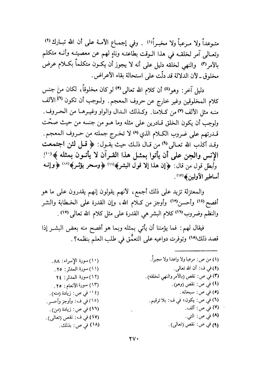 دَلِيل آخر وَهُوَ أَن كَلَام الله تَعَالَى لَو كَانَ مخلوقا لَكَانَ من جنس كَلَام المخلوقين وَغير خَارج عَن حُرُوف المعجم