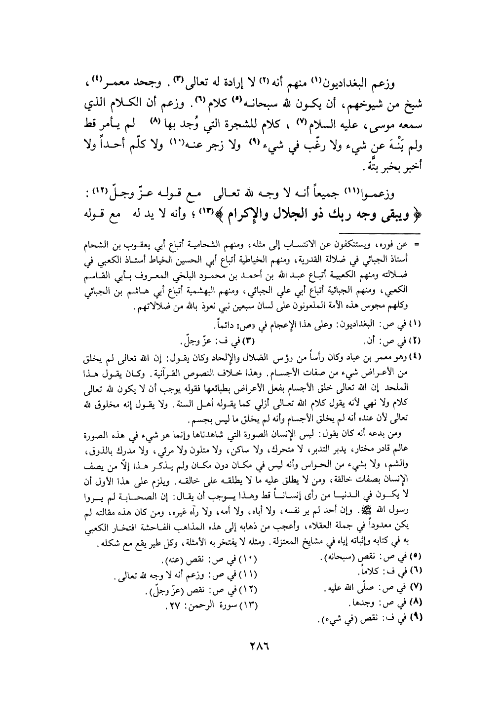وَزَعَمُوا جَمِيعًا أَنه لَا وَجه لله تَعَالَى مَعَ قَوْله عز وَجل {وَيبقى وَجه رَبك ذُو الْجلَال وَالْإِكْرَام} وَأَنه لَا يَد لَهُ مَعَ قَوْله
