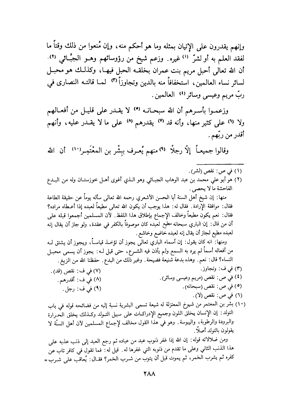 وَقَالُوا جَمِيعًا إِلَّا رجلا مِنْهُم يعرف ببشر بن الْمُعْتَمِر أَن الله