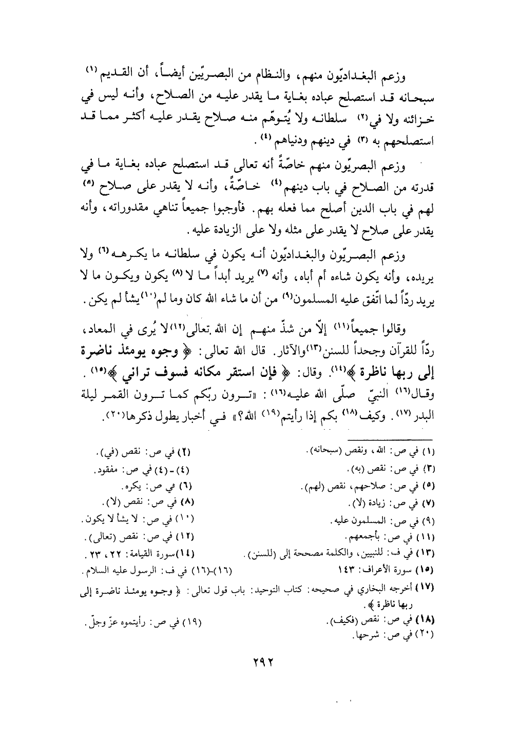 وَقَالُوا جَمِيعًا إِلَّا من شَذَّ مِنْهُم إِن الله تَعَالَى لَا يرى فِي الْمعَاد ردا لِلْقُرْآنِ وجحدا للسنن والْآثَار