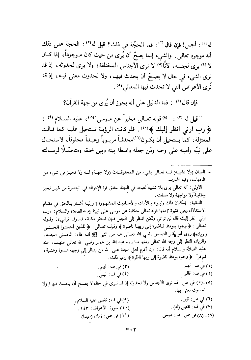 فَإِن قَالَ فَمَا الدَّلِيل على أَنه يجوز أَن يرى من جِهَة الْقُرْآن