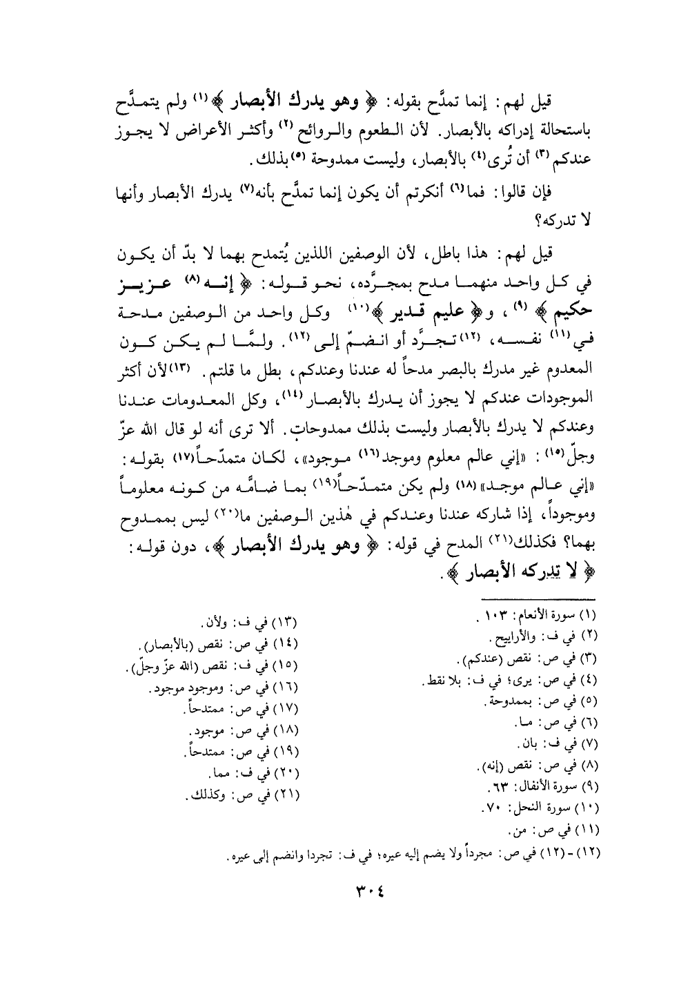 أَلا ترى أَنه لَو قَالَ الله عز وَجل إِنِّي عَالم مَعْلُوم وموجد مَوْجُود لَكَانَ متمدحا بقوله إِنِّي عَالم موجد وَلم يكن متمدحا بِمَا ضامه من كَونه مَعْلُوما وموجودا إِذا شَاركهُ عندنَا وعندكم فِي هذَيْن الوصفين مَا لَيْسَ بممدوح بهما فَكَذَلِك الْمَدْح فِي قَوْله {وَهُوَ يدْرك الْأَبْصَار} دون قَوْله {لَا تُدْرِكهُ الْأَبْصَار}