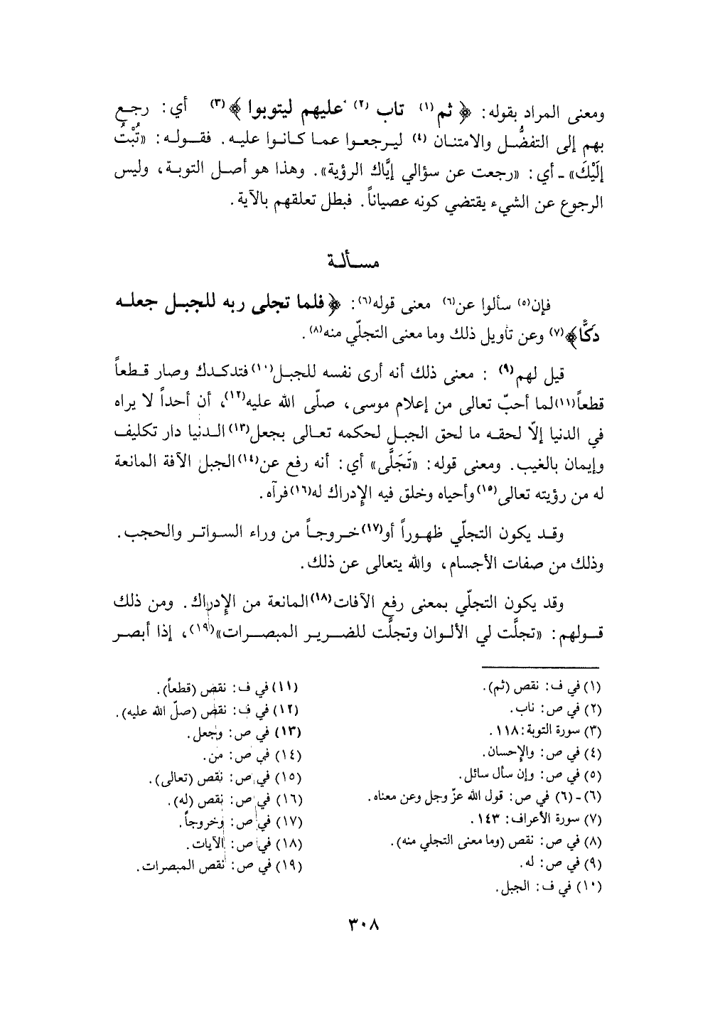 فَإِن سَأَلُوا عَن معنى قَوْله {فَلَمَّا تجلى ربه للجبل جعله دكا} وَعَن تَأْوِيل ذَلِك وَمَا معنى التجلي مِنْهُ