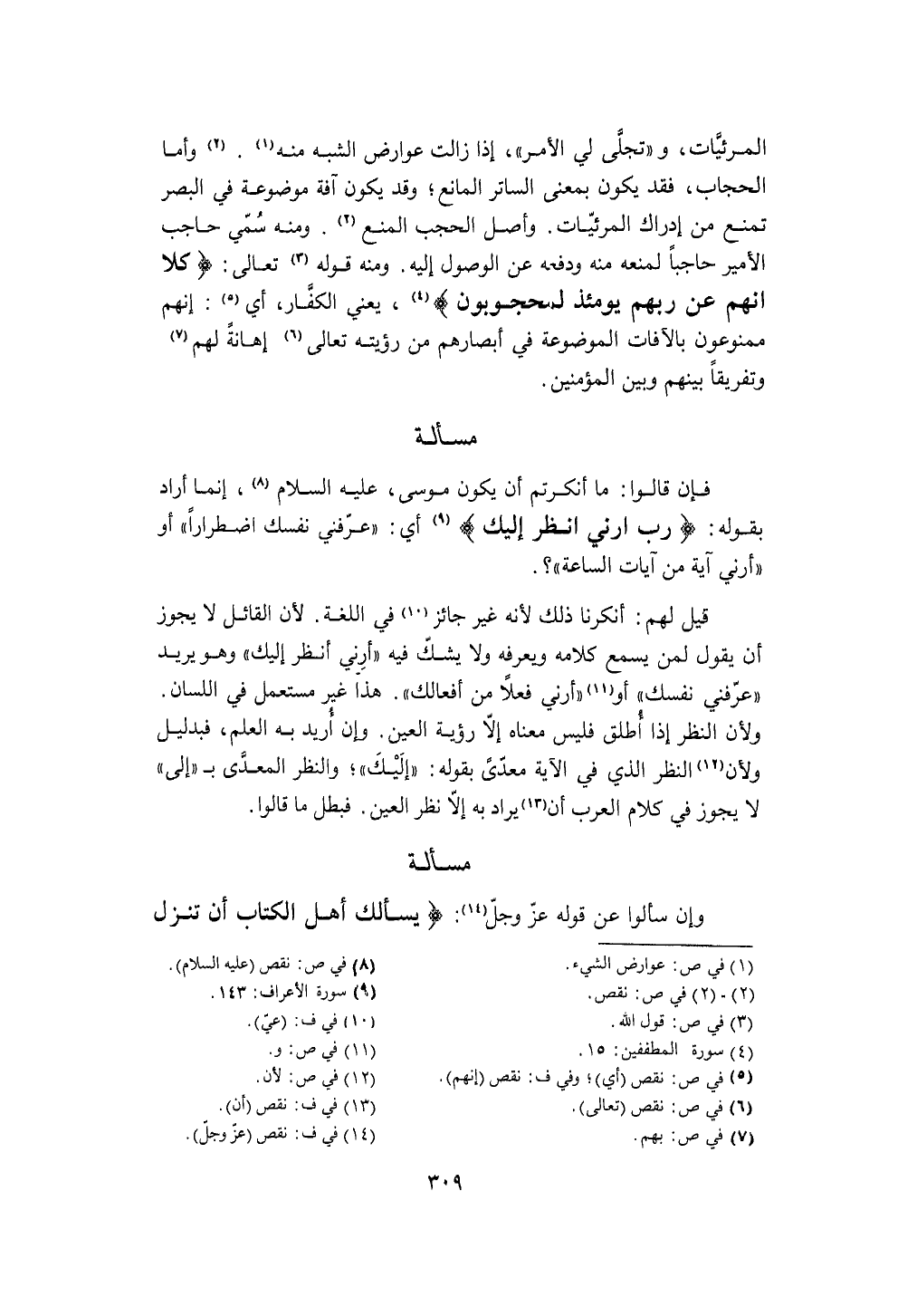 فَإِن قَالُوا مَا أنكرتم أَن يكون مُوسَى عَلَيْهِ السَّلَام إِنَّمَا أَرَادَ بقوله {رب أَرِنِي أنظر إِلَيْك} أَي عرفني نَفسك اضطرارا أَو أَرِنِي آيَة من آيَات السَّاعَة