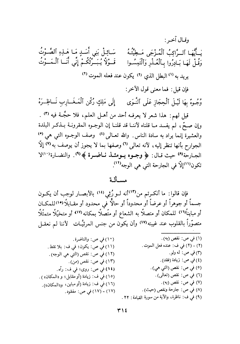 فَإِن قَالُوا مَا أنكرتم من أَنه لَو رئي بالأبصار لوَجَبَ أَن يكون جسما أَو جوهرا أَو عرضا أَو محدودا أَو حَالا فِي مَحْدُود أَو مُقَابلا للمكان أَو مباينا للمكان أَو مُتَّصِلا بِهِ الشعاع أَو مُتَّصِلا بمكانه أَو متخيلا متمثلا متصورا بالقلوب عِنْد غيبته وَأَن يكون من جنس المرئيات لأننا لم نعقل