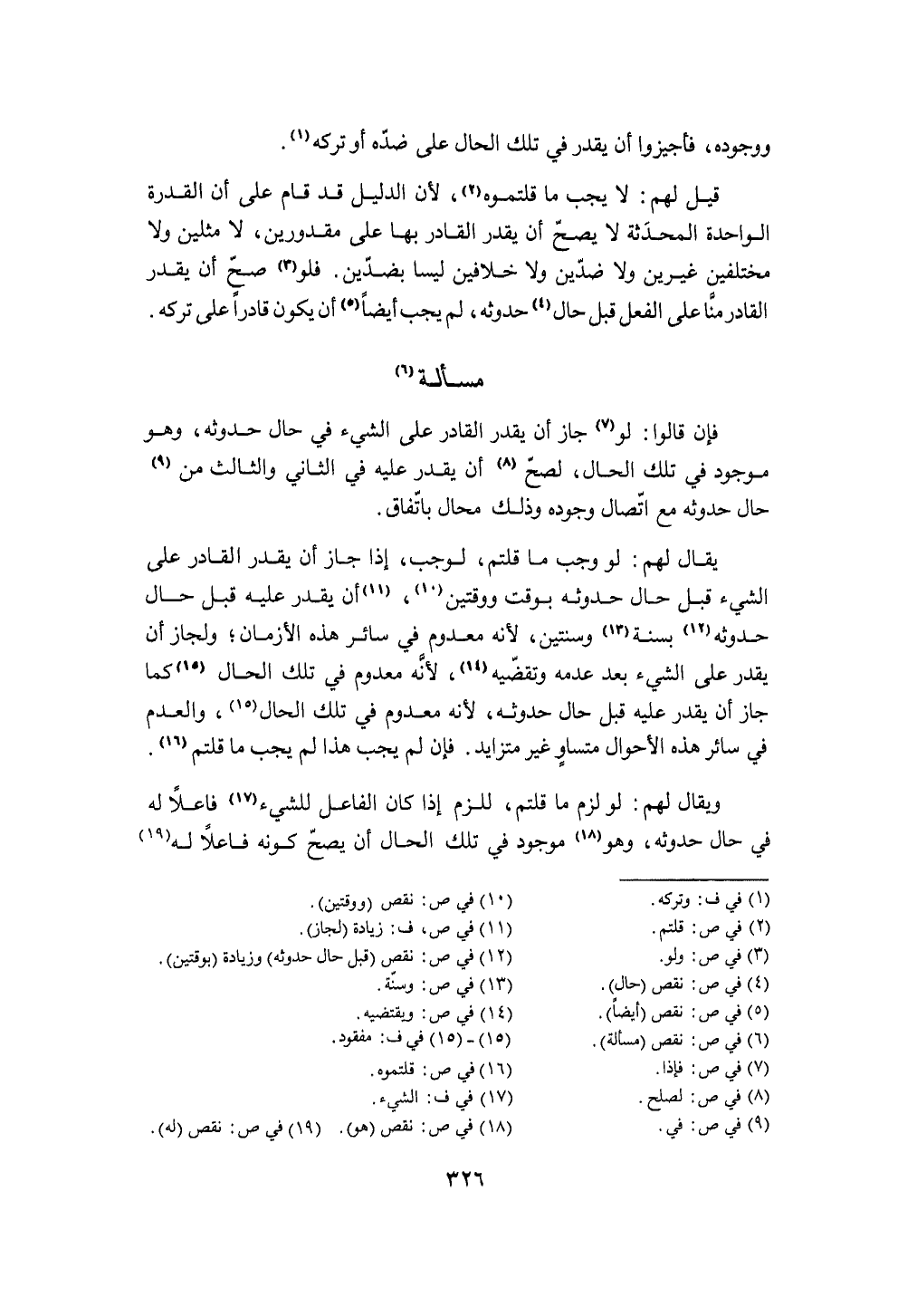 يُقَال لَهُم لَو وَجب مَا قُلْتُمْ لوَجَبَ إِذا جَازَ أَن يقدر الْقَادِر على الشَّيْء قبل حَال حُدُوثه بِوَقْت ووقتين أَن يقدر عَلَيْهِ قبل حَال حُدُوثه بِسنة وسنتين لِأَن مَعْدُوم فِي سَائِر هَذِه الْأَزْمَان ولجاز أَن يقدر على الشَّيْء بعد عَدمه وتقضيه لِأَنَّهُ مَعْدُوم فِي تِلْكَ الْحَال كَمَا جَازَ أَن يقدر عَلَيْهِ قبل حَال حُدُوثه لِأَنَّهُ مَعْدُوم فِي تِلْكَ الْحَال والعدم فِي سَائِر هَذِه الْأَحْوَال متساو غير متزايد