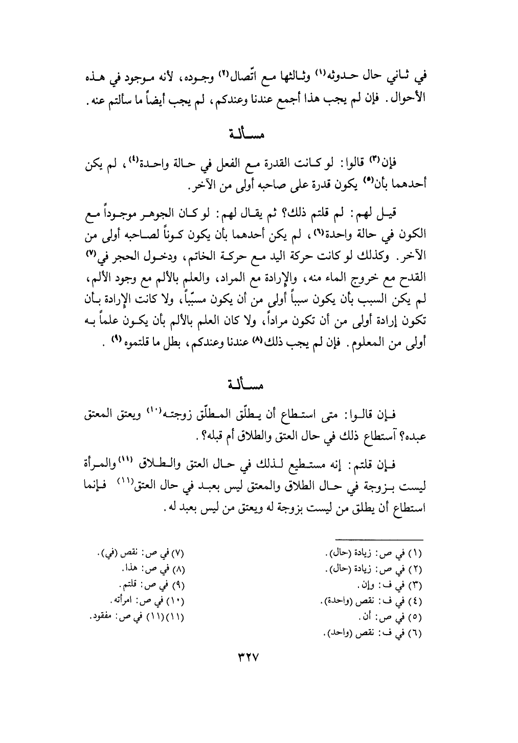 وَكَذَلِكَ لَو كَانَت حَرَكَة الْيَد مَعَ حَرَكَة الْخَاتم وَدخُول الْحجر فِي الْقدح مَعَ خُرُوج المَاء مِنْهُ والإرادة مَعَ المُرَاد وَالْعلم بالألم مَعَ وجود الْأَلَم لم يكن السَّبَب بِأَن يكون سَببا أولى من أَن يكون مسببا وَلَا كَانَت الْإِرَادَة بِأَن تكون إِرَادَة أولى من أَن تكون مرَادا وَلَا كَانَ الْعلم بالألم بِأَن يكون علما بِهِ أولى من الْمَعْلُوم