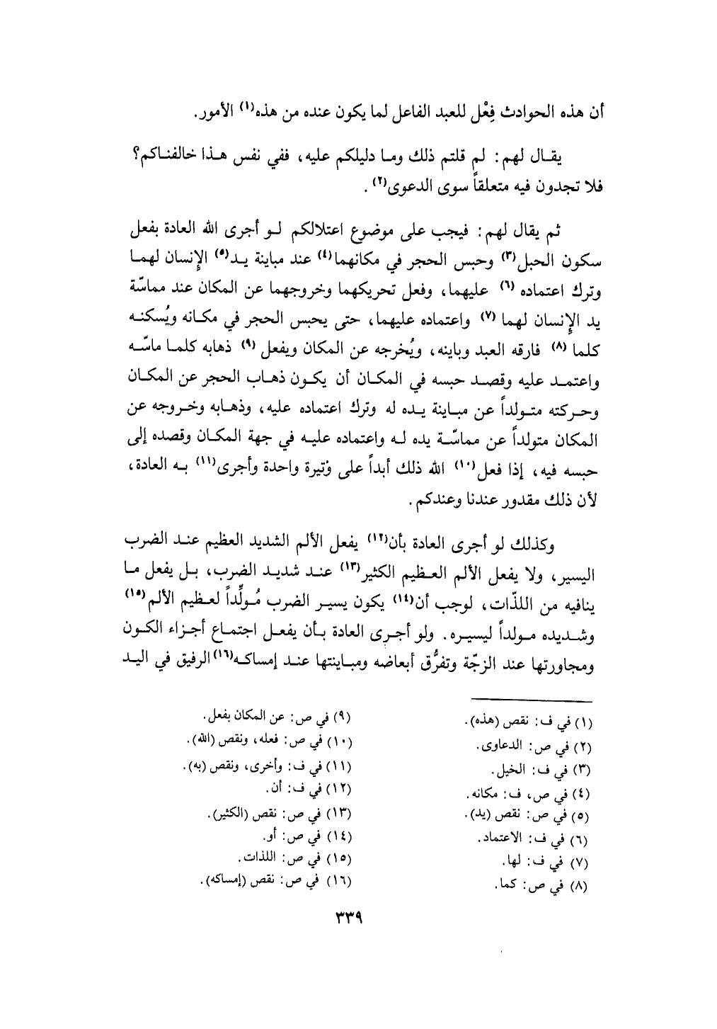 ثمَّ يُقَال لَهُم فَيجب على مَوْضُوع اعتلالكم لَو أجْرى الله الْعَادة بِفعل سُكُون الْحَبل وَحبس الْحجر فِي مكانهما عِنْد مباينة يَد الْإِنْسَان لَهما وَترك اعْتِمَاده عَلَيْهِمَا وَفعل تحريكهما وخروجهما عَن الْمَكَان عِنْد مماسة يَد الْإِنْسَان لَهما واعتماده عَلَيْهِمَا حَتَّى يحبس الْحجر فِي مَكَانَهُ ويسكنه كلما فَارقه العَبْد وباينه ويخرجه عَن الْمَكَان وَيفْعل ذَهَابه كلما ماسه وَاعْتمد عَلَيْهِ وَقصد حَبسه فِي الْمَكَان أَن يكون ذهَاب الْحجر عَن الْمَكَان وحركته متولدا عَن مباينة يَده لَهُ وَترك اعْتِمَاده عَلَيْهِ وذهابه وَخُرُوجه عَن الْمَكَان متولدا عَن مماسة يَده لَهُ واعتماده عَلَيْهِ فِي جِهَة الْمَكَان وقصده إِلَى حَبسه فِيهِ إِذا فعل الله ذَلِك أبدا على وتيرة وَاحِدَة وأجرى بِهِ الْعَادة لِأَن ذَلِك مَقْدُور عندنَا وعندكم