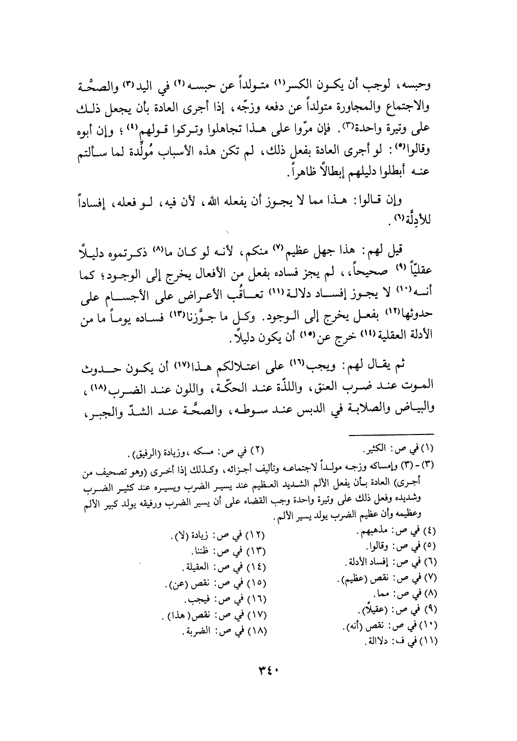 ثمَّ يُقَال لَهُم وَيجب على اعتلالكم هَذَا أَن يكون حُدُوث الْمَوْت عِنْد ضرب الْعُنُق واللذة عِنْد الحكة واللون عِنْد الضَّرْب وَالْبَيَاض والصلابة فِي الدبس عِنْد سَوْطه وَالصِّحَّة عِنْد الشد والجبر