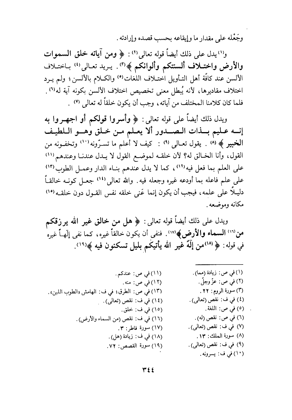 يُرِيد تَعَالَى باخْتلَاف الألسن عِنْد كَافَّة أهل التَّأْوِيل اخْتِلَاف اللُّغَات وَالْكَلَام بالألسن وَلم يرد اخْتِلَاف مقاديرها لِأَنَّهُ يبطل معنى تَخْصِيص اخْتِلَاف الألسن بِكَوْنِهِ آيَة لَهُ فَلَمَّا كَانَ كلامنا الْمُخْتَلف من آيَاته وَجب أَن يكون خلقا لَهُ تَعَالَى