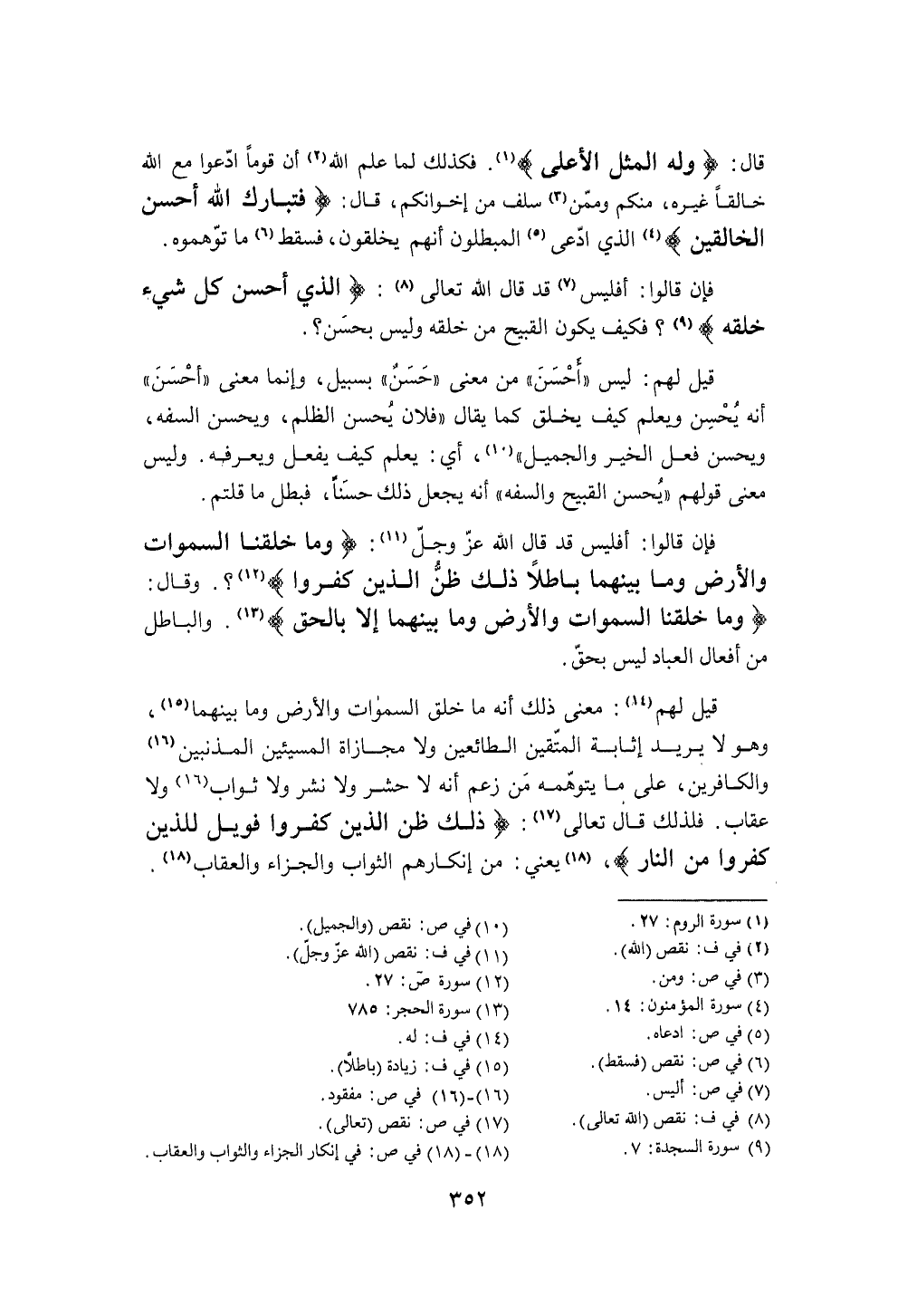 قيل لَهُم معنى ذَلِك أَنه مَا خلق السَّمَوَات وَالْأَرْض وَمَا بَينهمَا وَهُوَ لَا يُرِيد إثابة الْمُتَّقِينَ الطائعين وَلَا مجاراة المسيئين المذنبين والكافرين على مَا يتوهمه من زعم أَنه لَا حشر وَلَا نشر وَلَا ثَوَاب وَلَا عِقَاب
